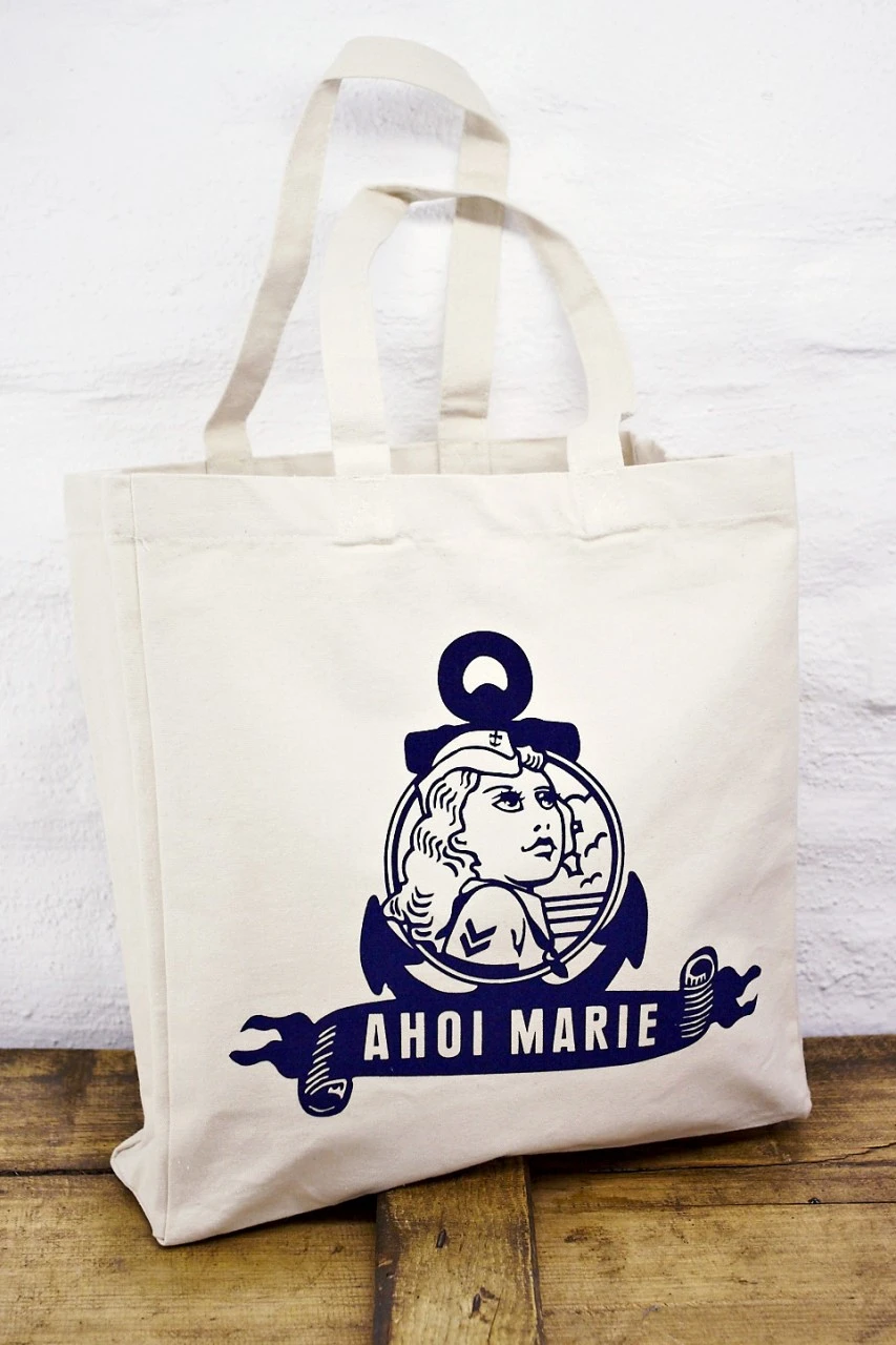 Diese Ahoi Marie Einkaufstasche wurde aus hochqualitativer, organischer Baumwolle hergestellt und in der Ahoi-Marie-Werkstatt beflockt. Durch den sehr dicken und robusten Stoff und die liebevolle Verarbeitung überstehen sie mit ihren glücklichen Besitzern so manchen Einkauf, Ausflug und Spaziergang.