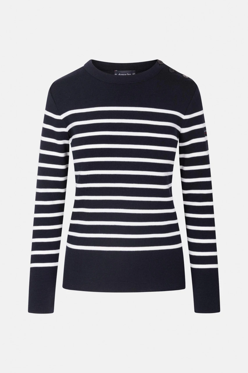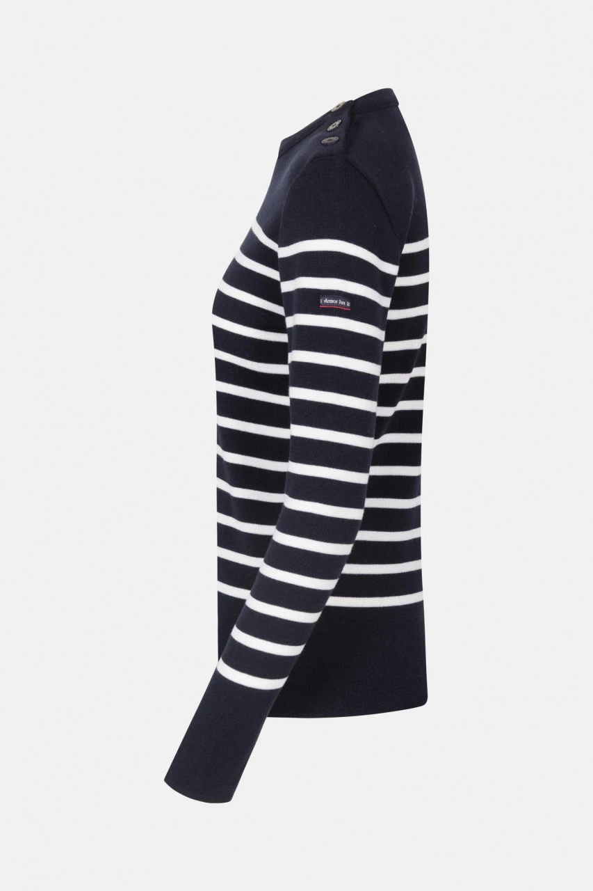 Klassischer gestreifter Damenpullover mit den typischen bretonischen Knöpfen auf der Schulter. Farben: Dunkelblau/Natur.Eigenschaften:
