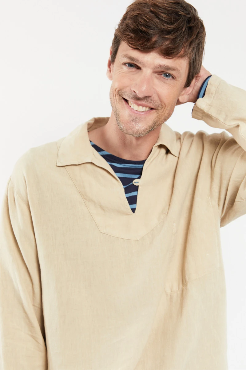 Das orginal bretonische Fischerhemd in einer hochwertigen Leinen-Qualität. Das Hemd verfügt über einen großen Schlitz, der über einen Knopf geschlossen werden kann.Die Brusttasche und der Knopf sind bei diesem Fischerhemd nach innen genäht. So blieben traditionell die Fischer bei Ihrer Arbeit nirgendwo hängen und es konnte ihnen nichts aus der Tasche fallen.Eigenschaften: