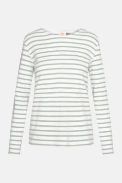 Langärmliges bretonisches Damen-Shirt mit leicht tailliertem, eng anliegendem Schnittmuster, Boot-Ausschnitt und Anker-Stick am Saum. Mit dem neuen Modell in hellgrün und weiß interpretiert Armor Lux diesen Klassiker neu! Das zeitlose Langarmshirt wird mit viel Liebe zum Detail in Frankreich gefertigt – gelebtes Heritage. Das gestreifte betronische Shirt wurde durch ein Gesetz, das am 27. März 1858 verabschiedet wurde, fester Bestandteil der Kleidervorschrift der französischen Seemänner. Man sagt, dass die blau-weißen Streifen das Lokalisieren von über Bord gegangener Männer erleichtern sollte.Eigenschaften: