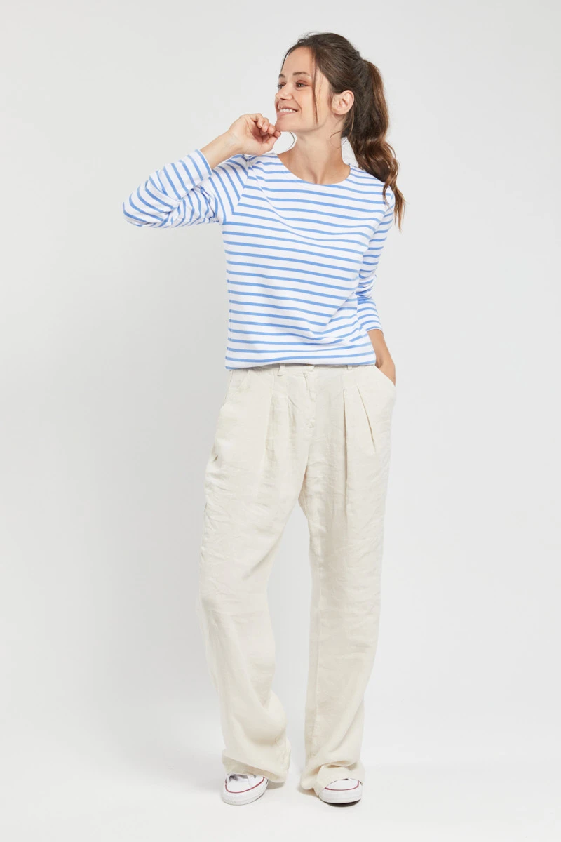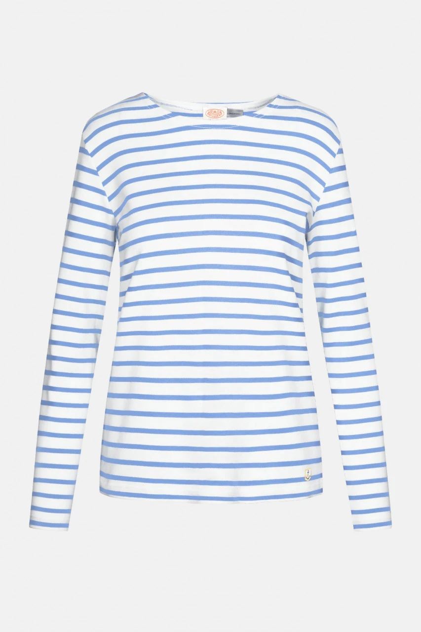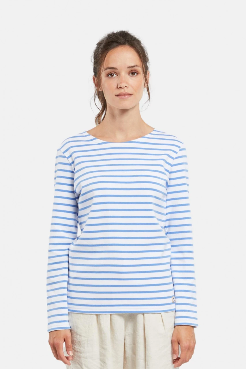 Langärmliges bretonisches Damen-Shirt mit leicht tailliertem, eng anliegendem Schnittmuster, Boot-Ausschnitt und Anker-Stick am Saum. Mit dem neuen Modell in einem hellen türkis blau und weiß interpretiert Armor Lux diesen Klassiker neu! Das zeitlose Langarmshirt wird mit viel Liebe zum Detail in Frankreich gefertigt – gelebtes Heritage. Das gestreifte betronische Shirt wurde durch ein Gesetz, das am 27. März 1858 verabschiedet wurde, fester Bestandteil der Kleidervorschrift der französischen Seemänner. Man sagt, dass die blau-weißen Streifen das Lokalisieren von über Bord gegangener Männer erleichtern sollte.Eigenschaften: