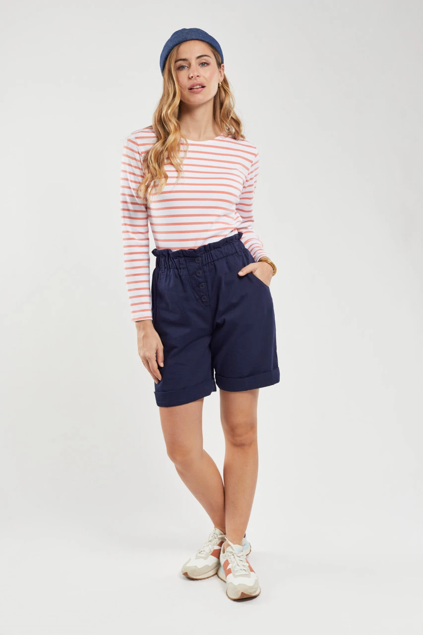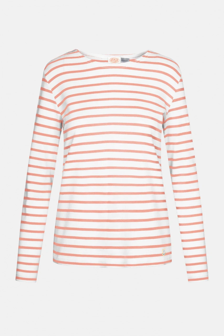 Langärmliges bretonisches Damen-Shirt mit leicht tailliertem, eng anliegendem Schnittmuster, Boot-Ausschnitt und Anker-Stick am Saum. Mit dem neuen Modell in einem lachs rosa und weiß interpretiert Armor Lux diesen Klassiker neu! Das zeitlose Langarmshirt wird mit viel Liebe zum Detail in Frankreich gefertigt – gelebtes Heritage. Das gestreifte betronische Shirt wurde durch ein Gesetz, das am 27. März 1858 verabschiedet wurde, fester Bestandteil der Kleidervorschrift der französischen Seemänner. Man sagt, dass die blau-weißen Streifen das Lokalisieren von über Bord gegangener Männer erleichtern sollte.Eigenschaften: