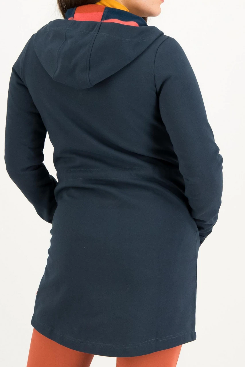Lange Kapuzenjacke von blutsgeschwister in Dunkelblau mit weichem Fleece-Futter in gestreiften Kontrast-Farben.Eigenschaften: