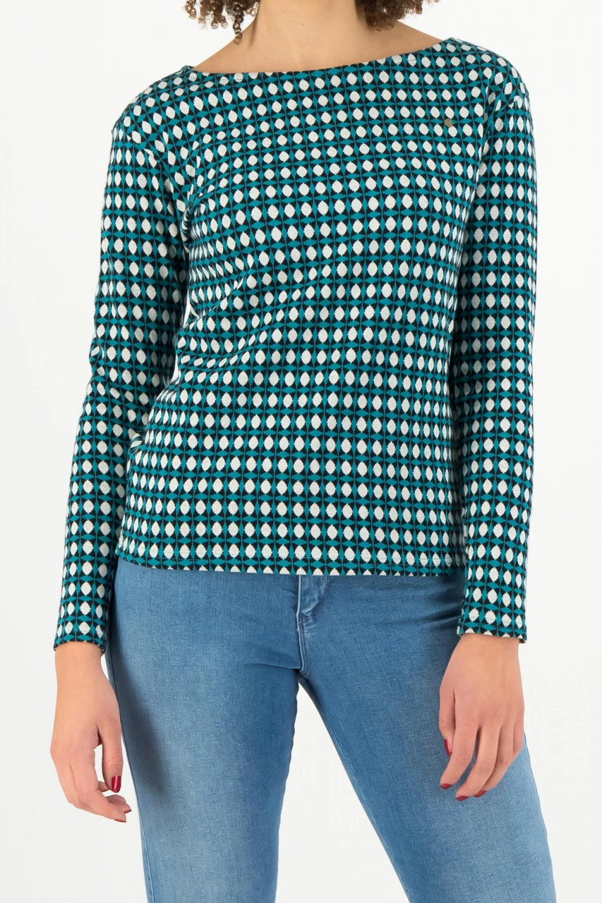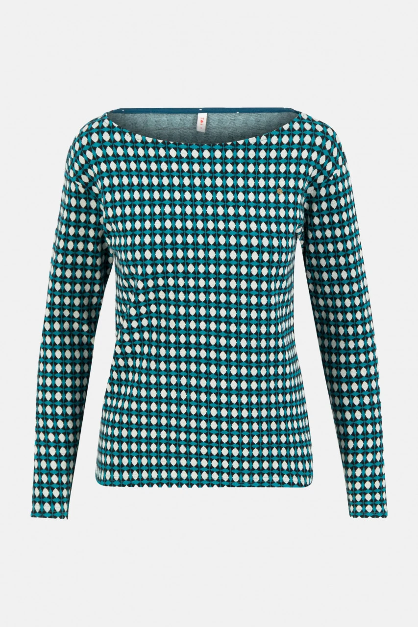 Leichter, langärmerliger Pullover von Blutsgeschwister mit schickem Muster in Türkis-Weiß-Schwarz und U-Boot-Ausschnitt.