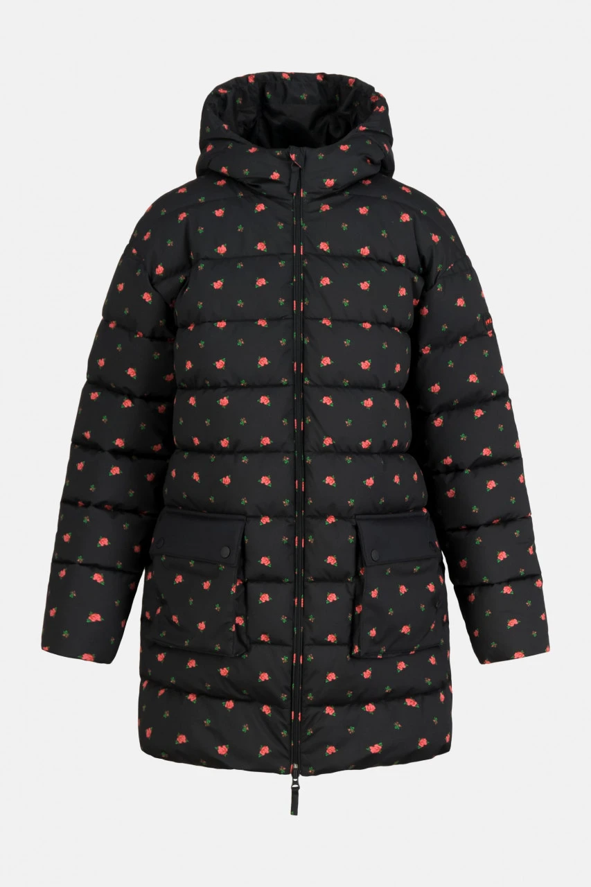 Moderne Damen Steppjacke mit Blumen-Muster in Schwarz und Rot von Blutsgeschwister. Mit dem Cloud Stepper Long kann der Winter kommen! Bei dieser Jacke ist der Name Programm: Weich wie eine Wolke hält die Jacke auch bei kaltem Wetter warm kuschelig.Eigenschaften: