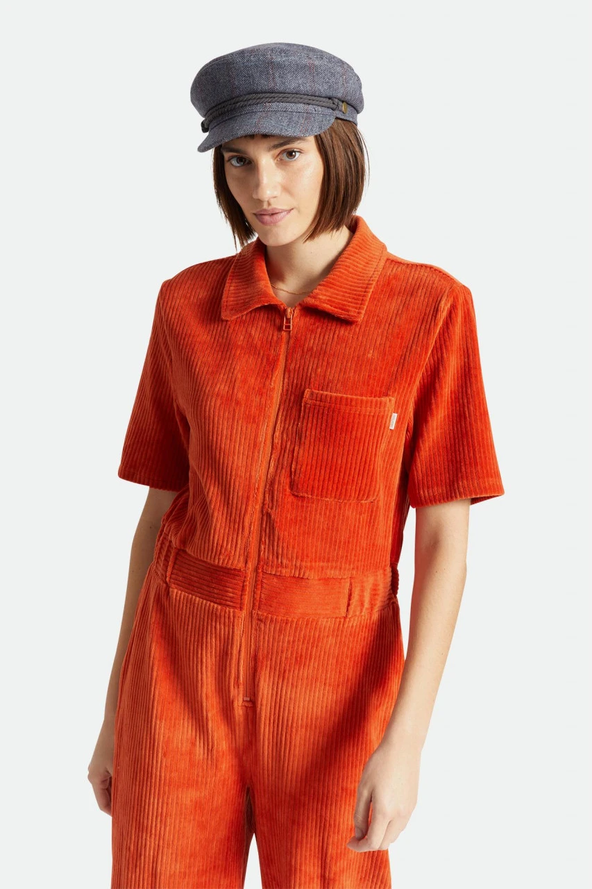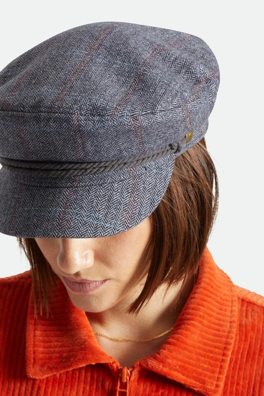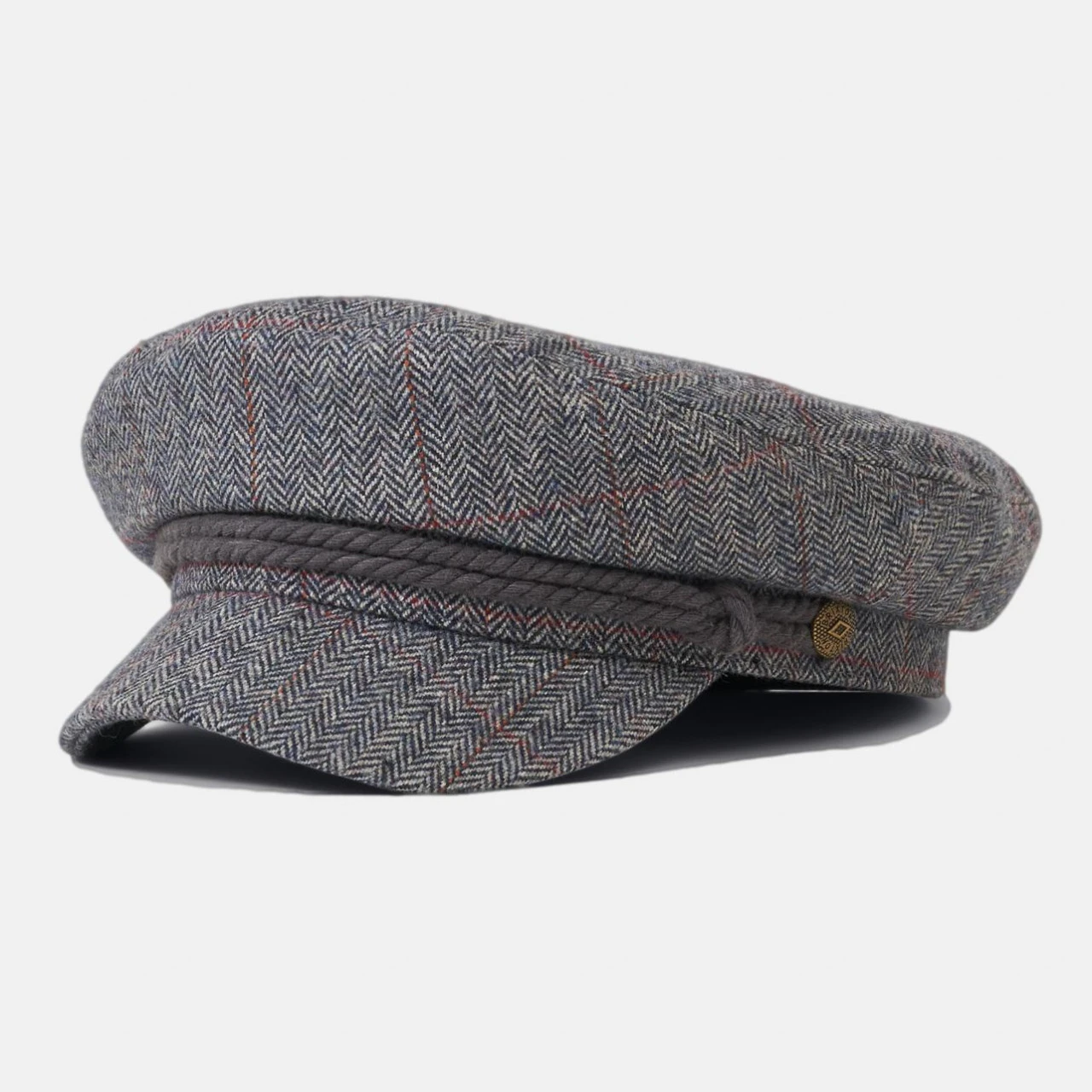 Stylischer Fiddler Elbsegler von Brixton in Grau-Blau-Weiß im Fischgrätmuster mit feinen roten und türkisen Streifen.Größenhinweis: