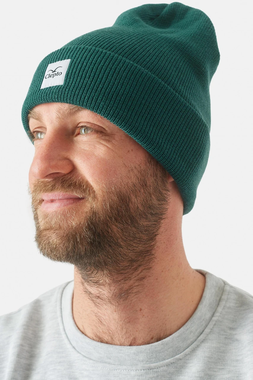 Klassische pflegeleichte Beanie Strickmütze von Cleptomanicx in einem schönen grünen Petrol-Farbton. Auf dem Umschlag ist das klassische Clepto Möwen-Logo als Aufnäher angebracht. Bringt garantiert Farbe in den Alltag!Nachhaltigkeit:
