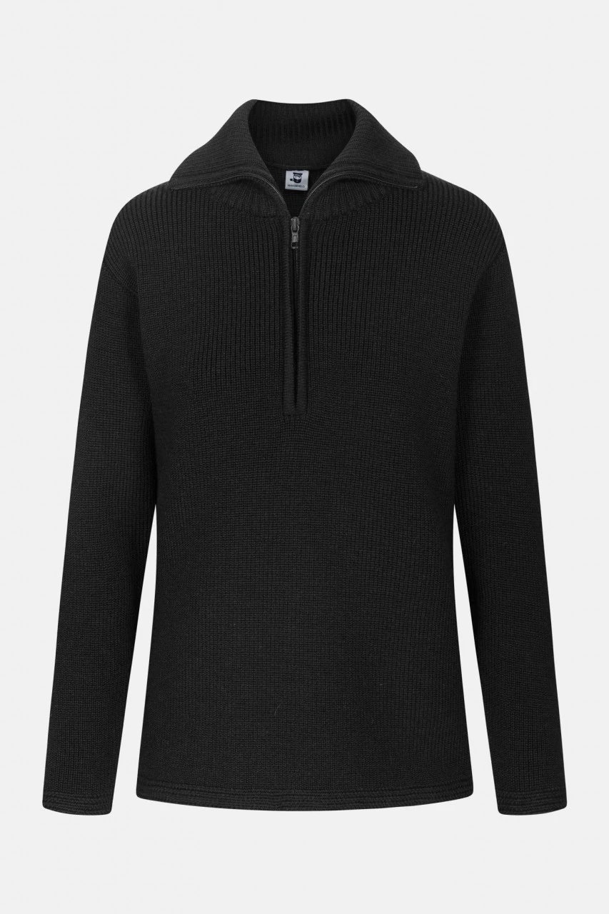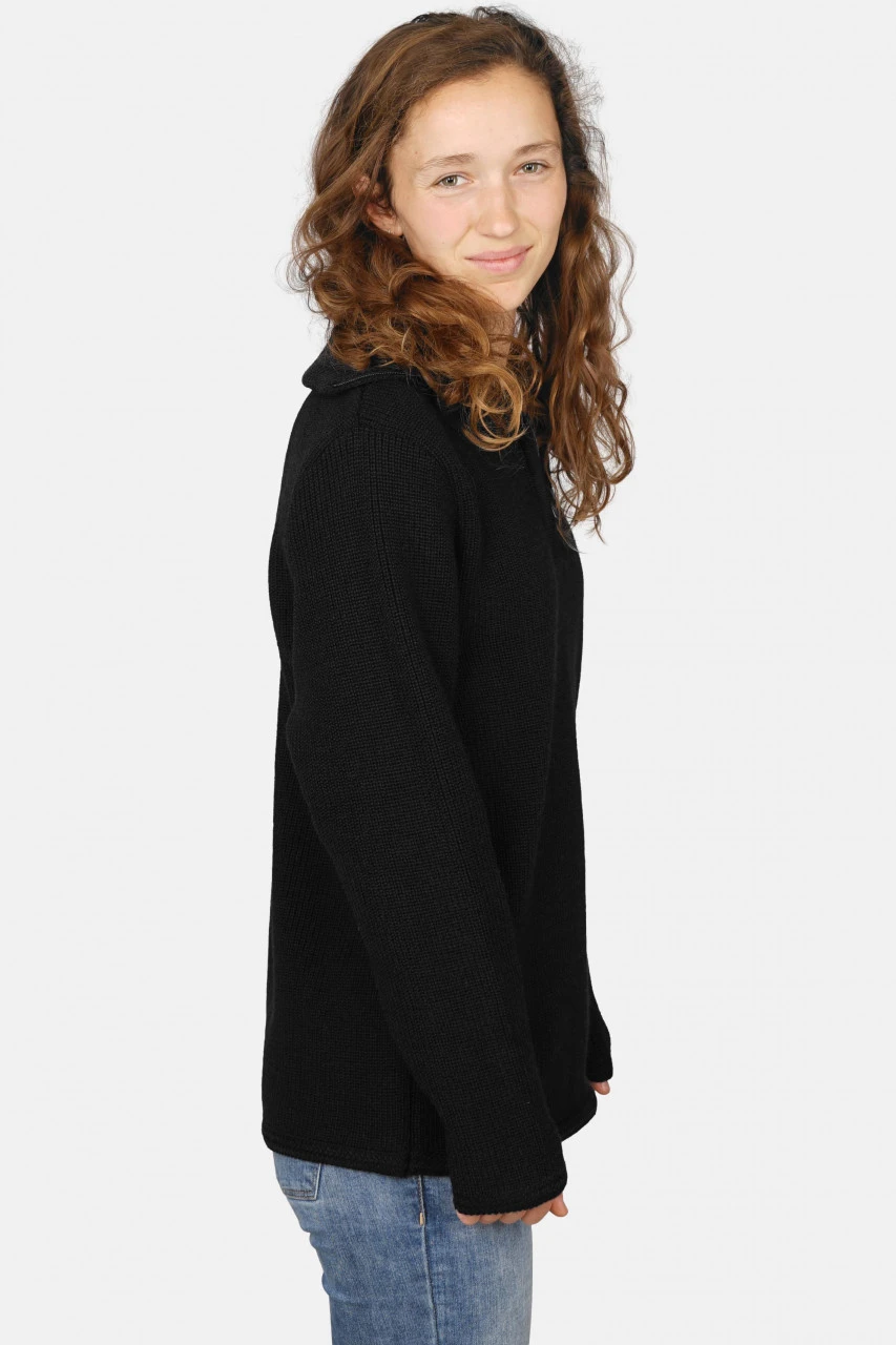 Schmal geschnittener, schwarzer Damen Woll-Troyer aus 100% Schurwolle. Statt Bündchen hat dieser Pullover elegante, glatt anliegende Abschlüsse. Nach traditioneller Art im robusten Perlfang mehrfädig aus gezwirnten Garnen gestrickt.Eigenschaften: