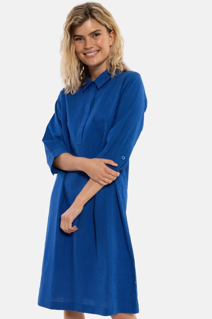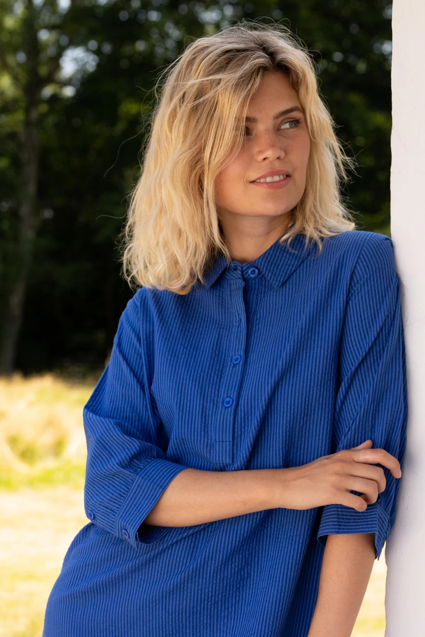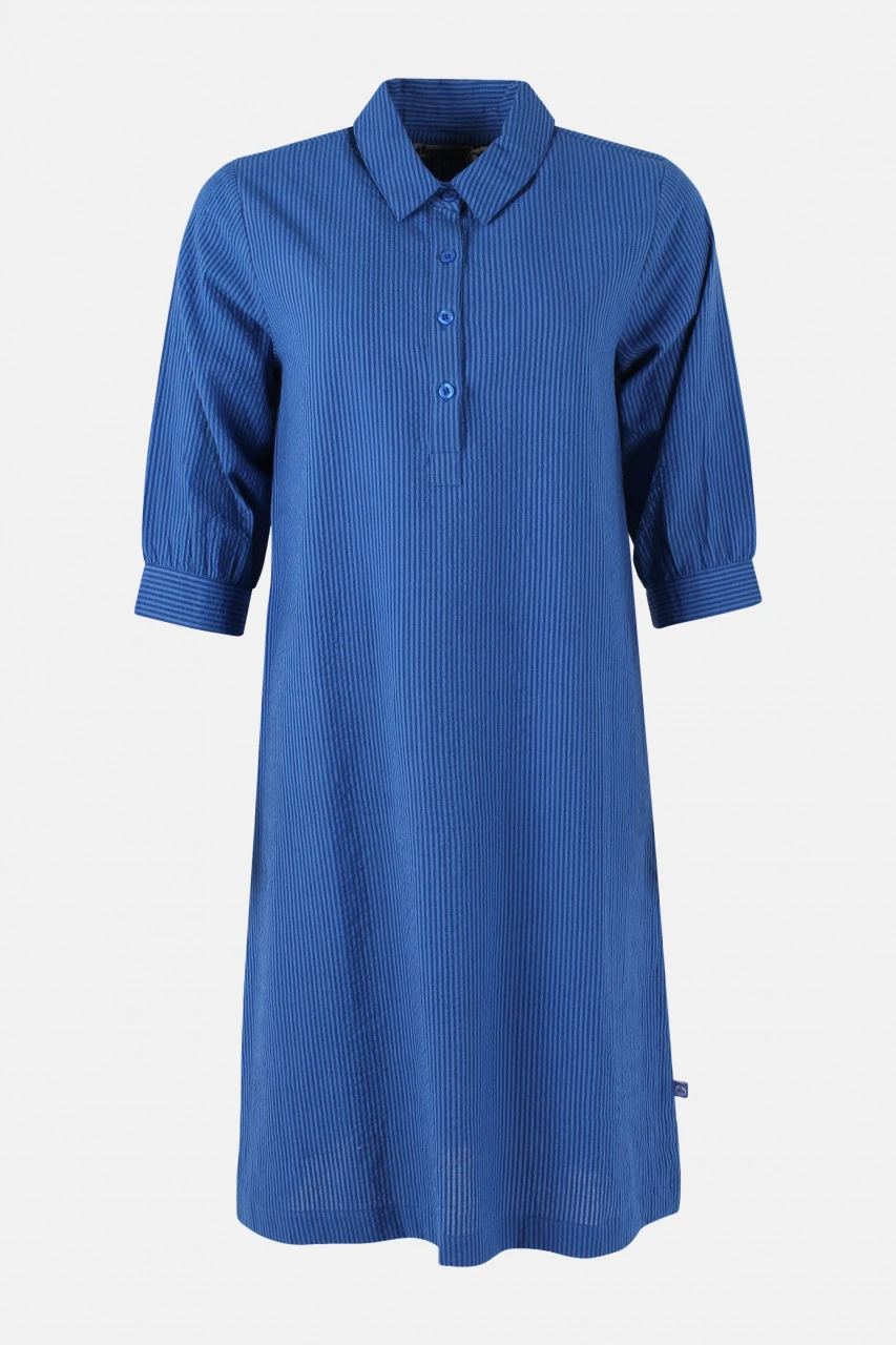 Kurzärmeliges Blusenkleid von Danefae für Damen in einem blaugestreiften Seersucker Stoff. Das Material in Krepp Optik ist besonders pflegeleicht und erinnert durch die Streifen an Fischerhemden.Eigenschaften: