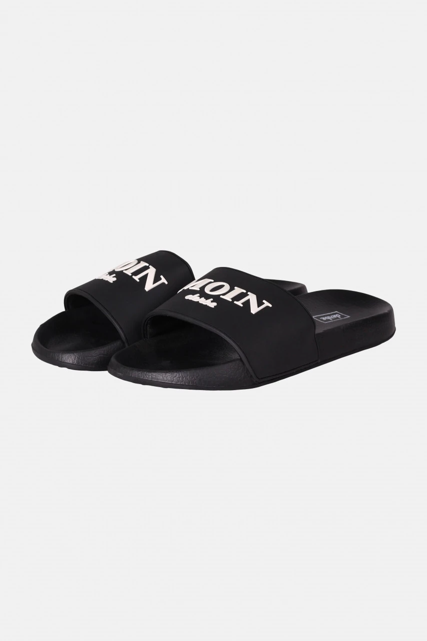 Stylische Badeschlappen von Derbe mit Moin-Schriftzug. Ganz klassisch in Schwarz mit Schriftzug in OffwhiteNachhaltigkeit: