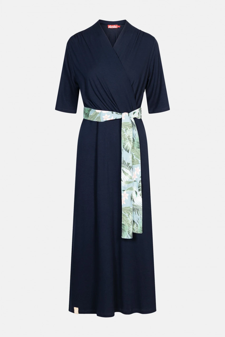 Dunkelblaues Kleid von Derbe für Damen mit gemustertem Blumen Gürtel. Etwas Sommer-Feeling gefällig? Das leichte Jersey-Kleid in Wickeloptik umschmeichelt durch die Raffungen sanft die Figur.Nachhaltigkeit: