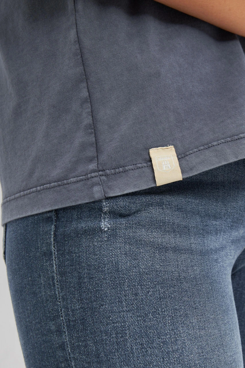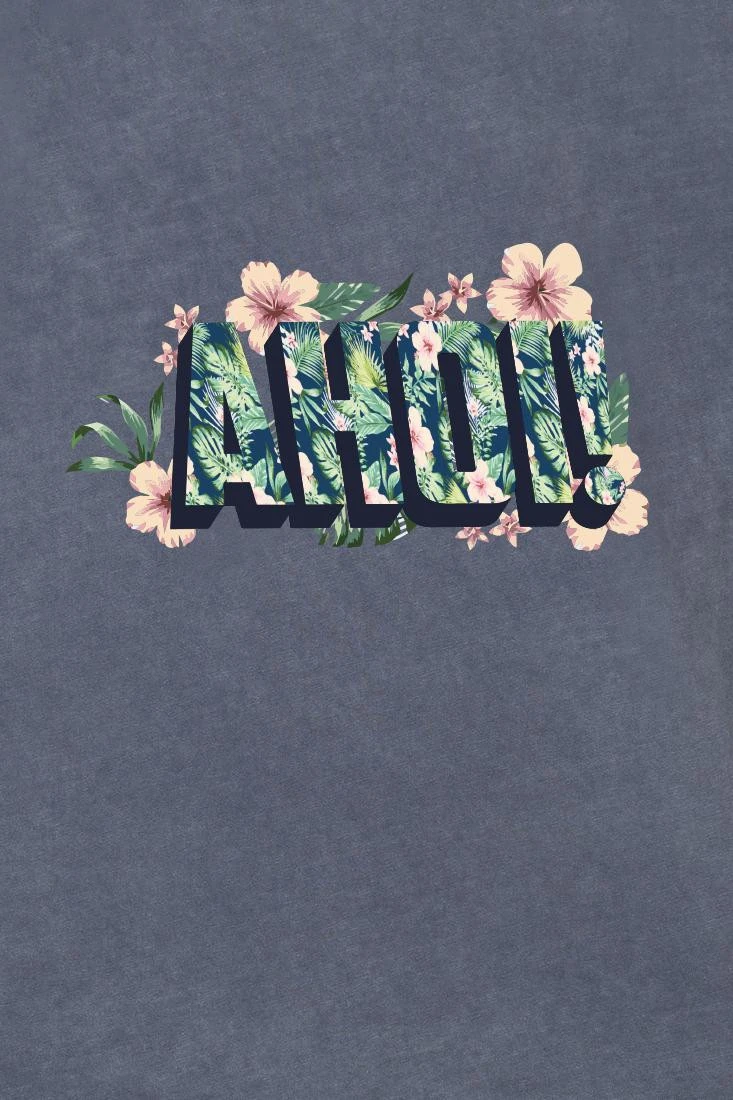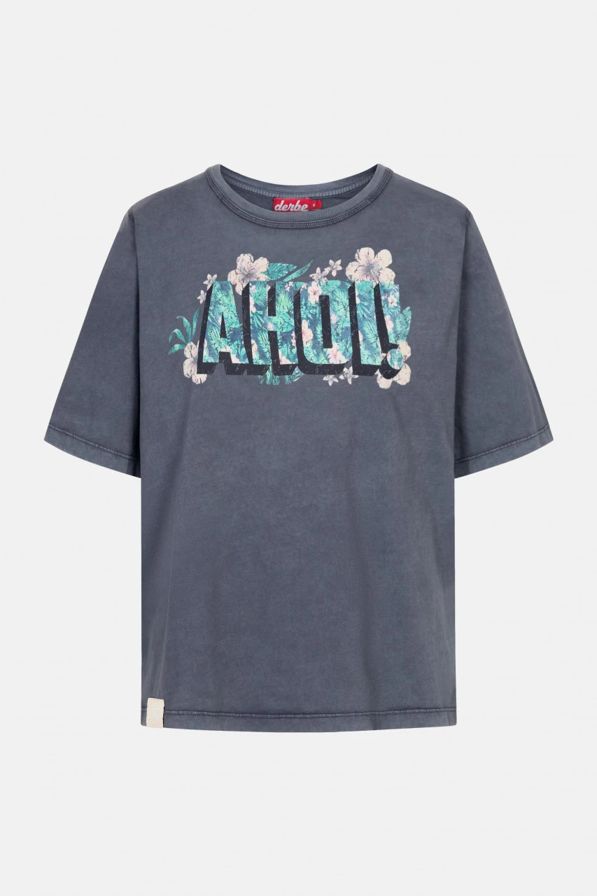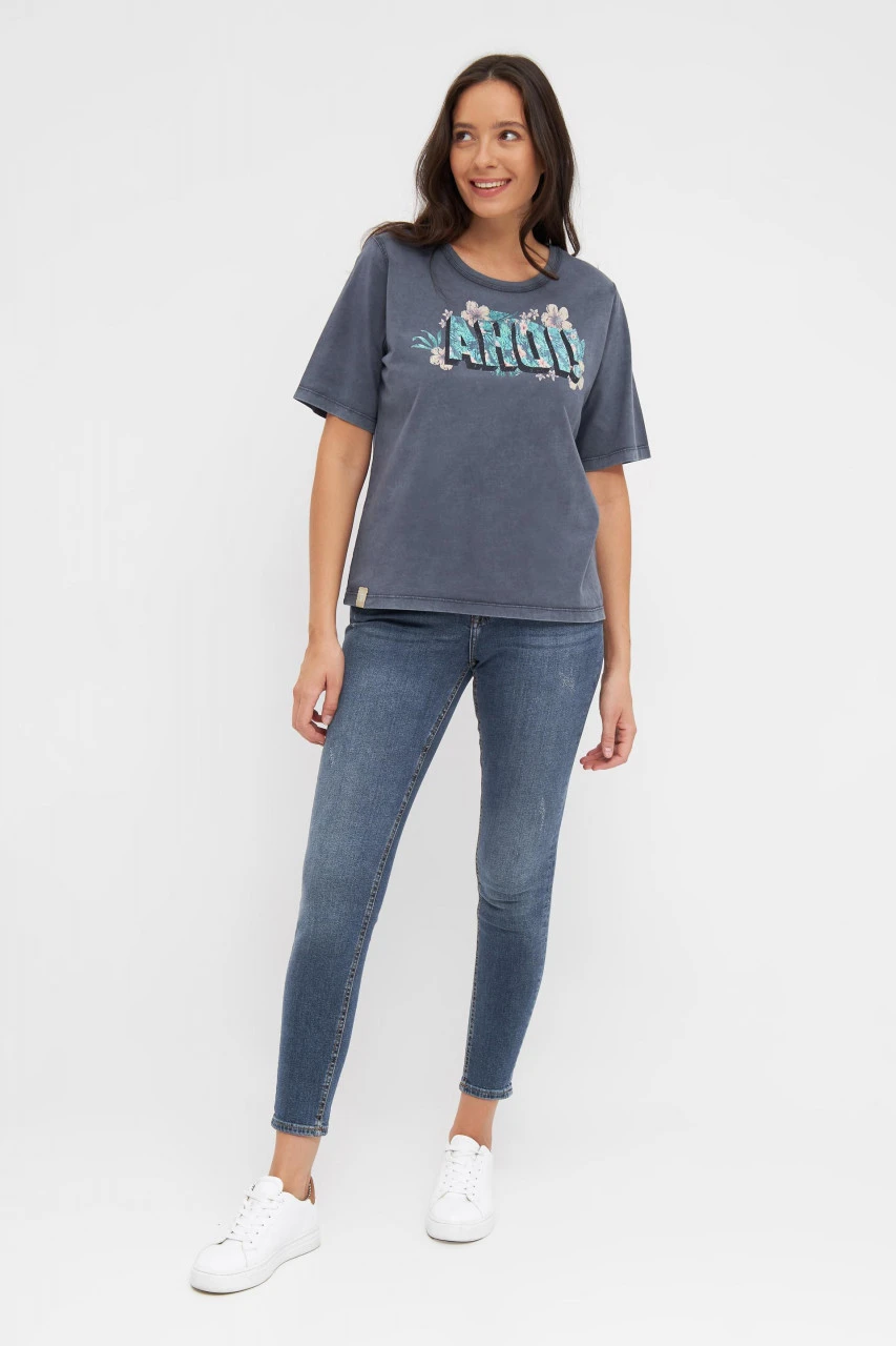Blau-Graues Damen T-Shirt von Derbe mit Washed Optik und schönem Retro Ahoi-Print im Hawaii Look.Nachhaltigkeit:
