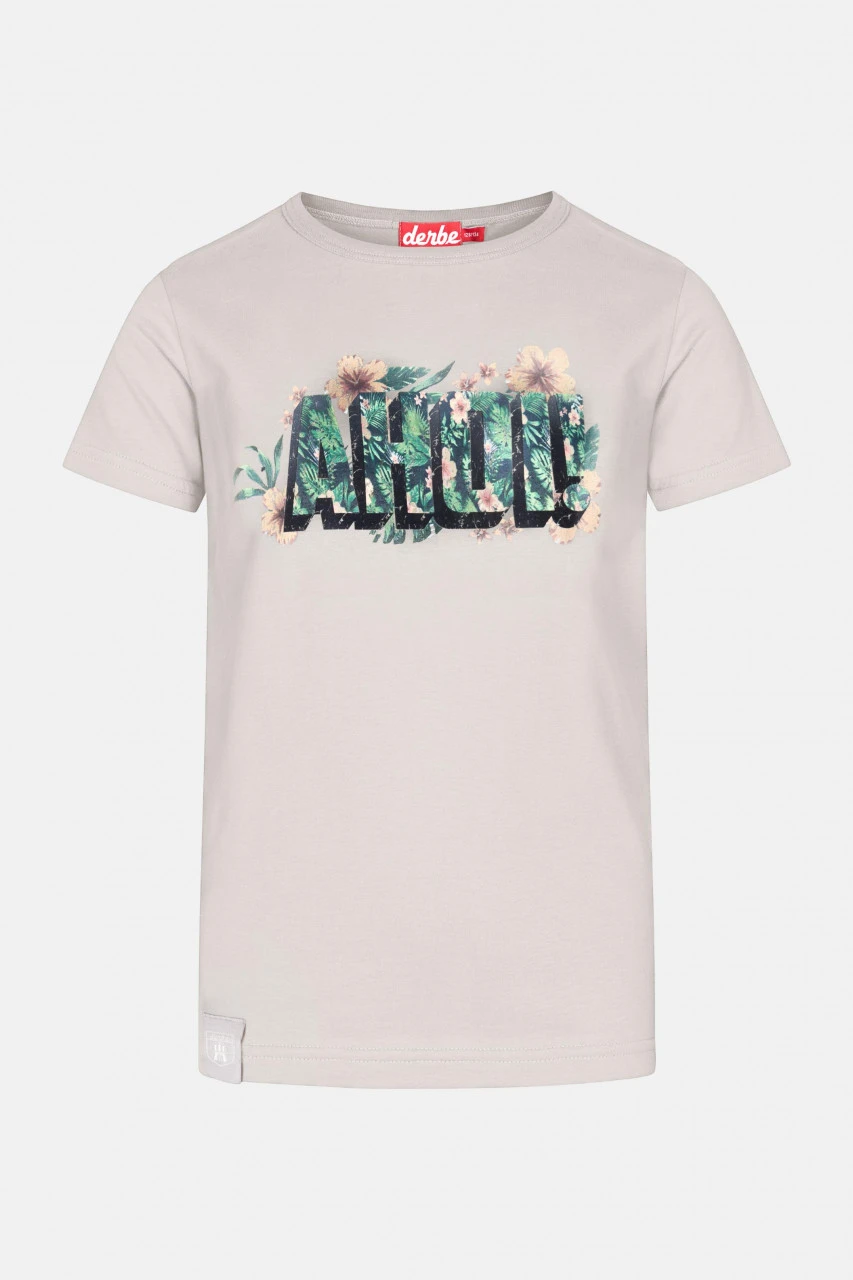 T-Shirt von Derbe für Kinder mit schönem Ahoi-Print im Hawaii Look. Die sommerlichen Blüten und Blätter bringen Farbe in den Alltag. Ahoi from Hamburg!Nachhaltigkeit: