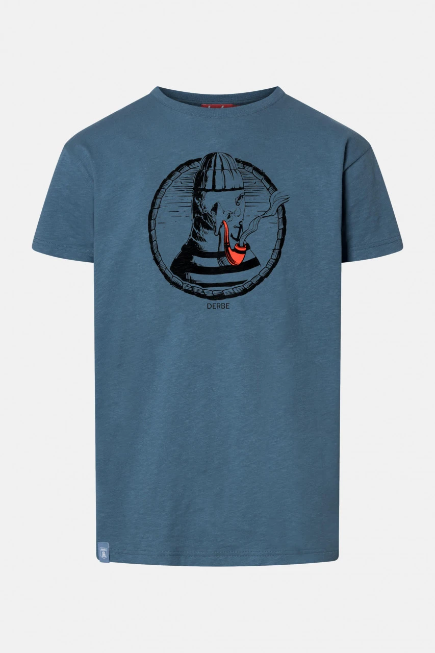 Herren T-Shirt in der Saisonfarbe Orion Blue von Derbe mit großem Möwenkopf. Die Matrosenmöwe macht Blau!Nachhaltigkeit:
