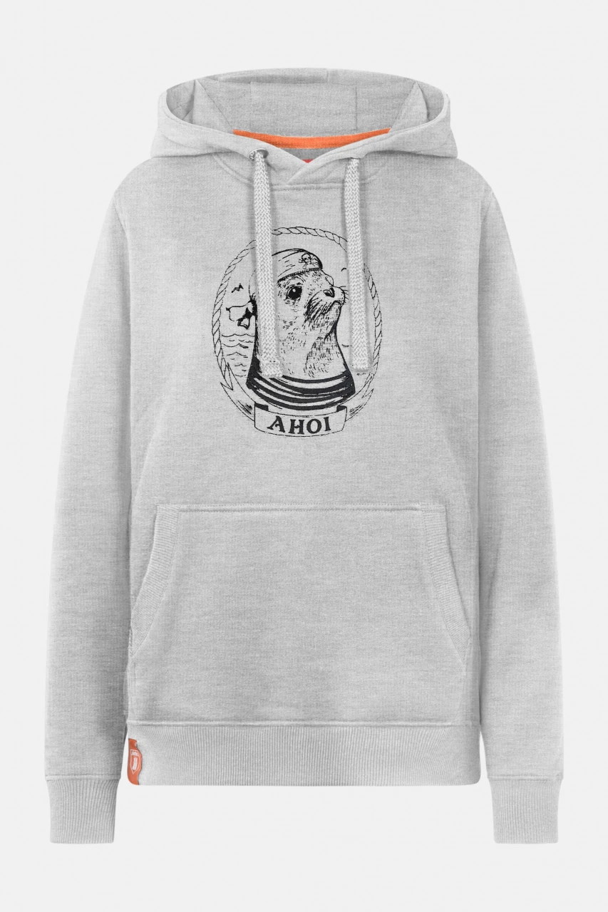 Grauer Derbe Kapuzenpullover für Damen mit großem Robben-Print auf der Brust. Ahoi Matrose!Nachhaltigkeit: