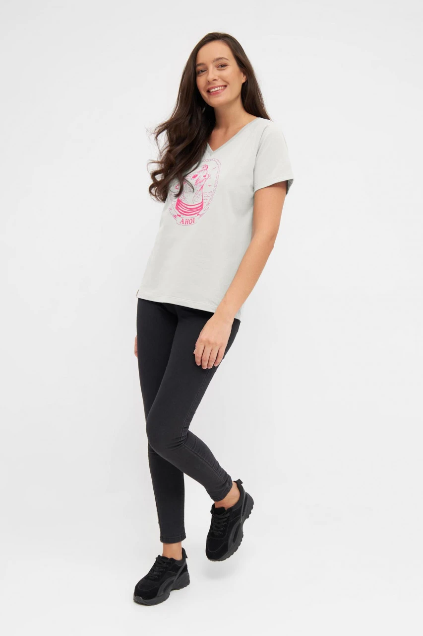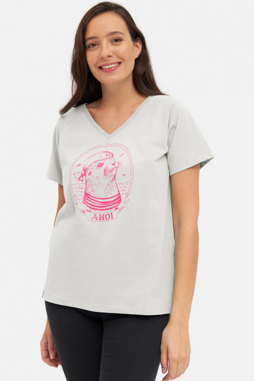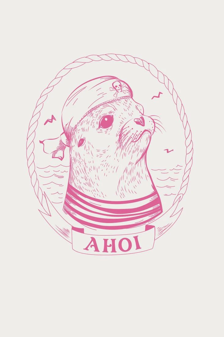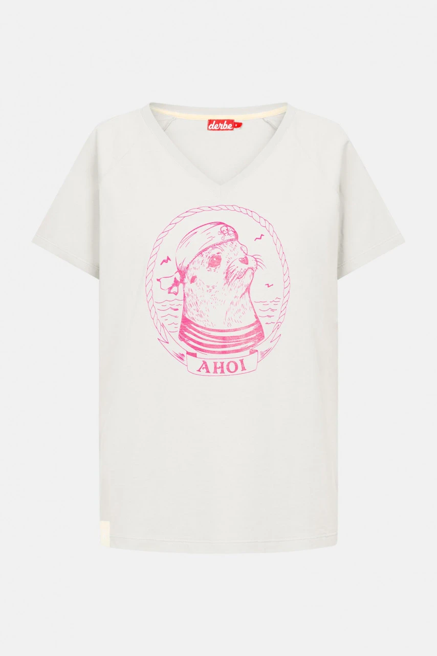 Weißes Derbe T-Shirt für Damen mit coolem Matrosen Robben Motiv in Pink. Ahoi ihr Landratten – Handgezeichnet zum Verlieben!Nachhaltigkeit: