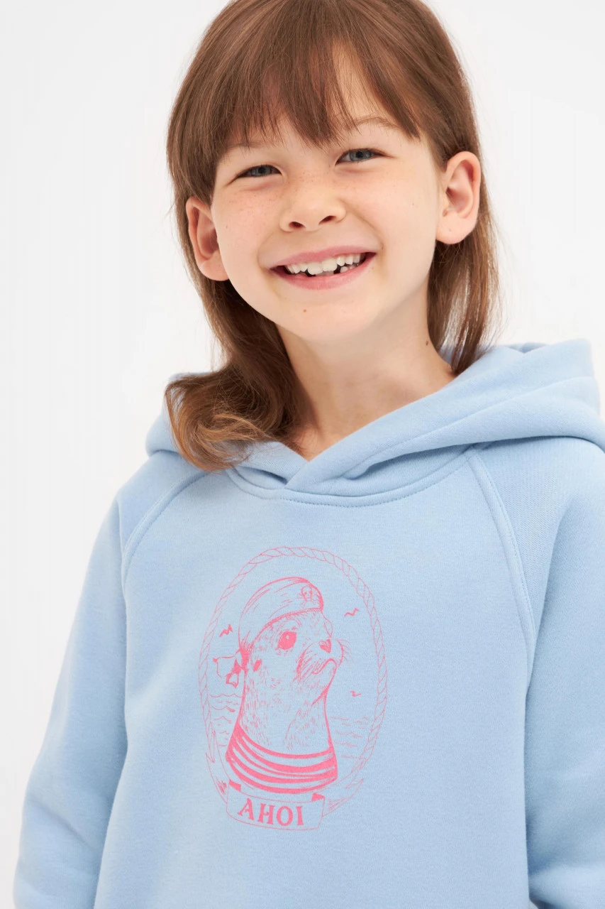 Hellblauer Derbe Kapuzenpullover für Kinder mit coolem Matrosen Robben Motiv in Pink. Ahoi ihr Landratten – Handgezeichnet zum Verlieben und extra weich durch die Materialmischung!Nachhaltigkeit: