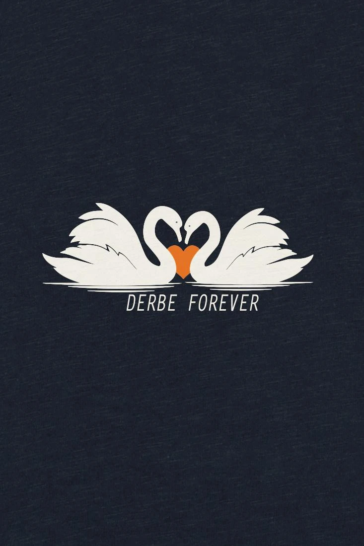 Dunkelblaues T-Shirt mit V-Ausschnitt und Schwanen-Print. Liebe für immer – Derbe für immer! Das schöne T-Shirt ist perfekt für Verliebte und solche, die es noch werden wollen.Nachhaltigkeit: