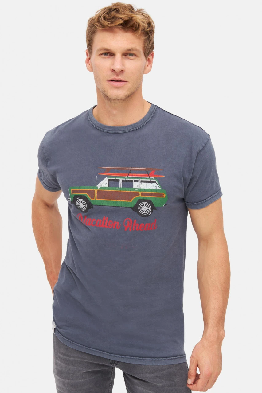 Herren T-Shirt von Derbe in Blau Grauer Washed Optik mit schönem Retro Van-Motiv.Nachhaltigkeit: