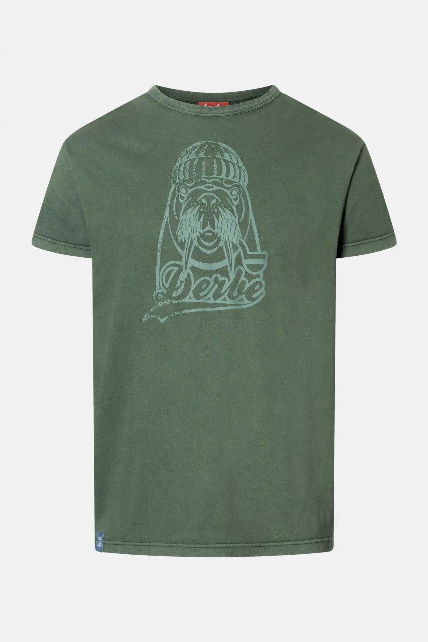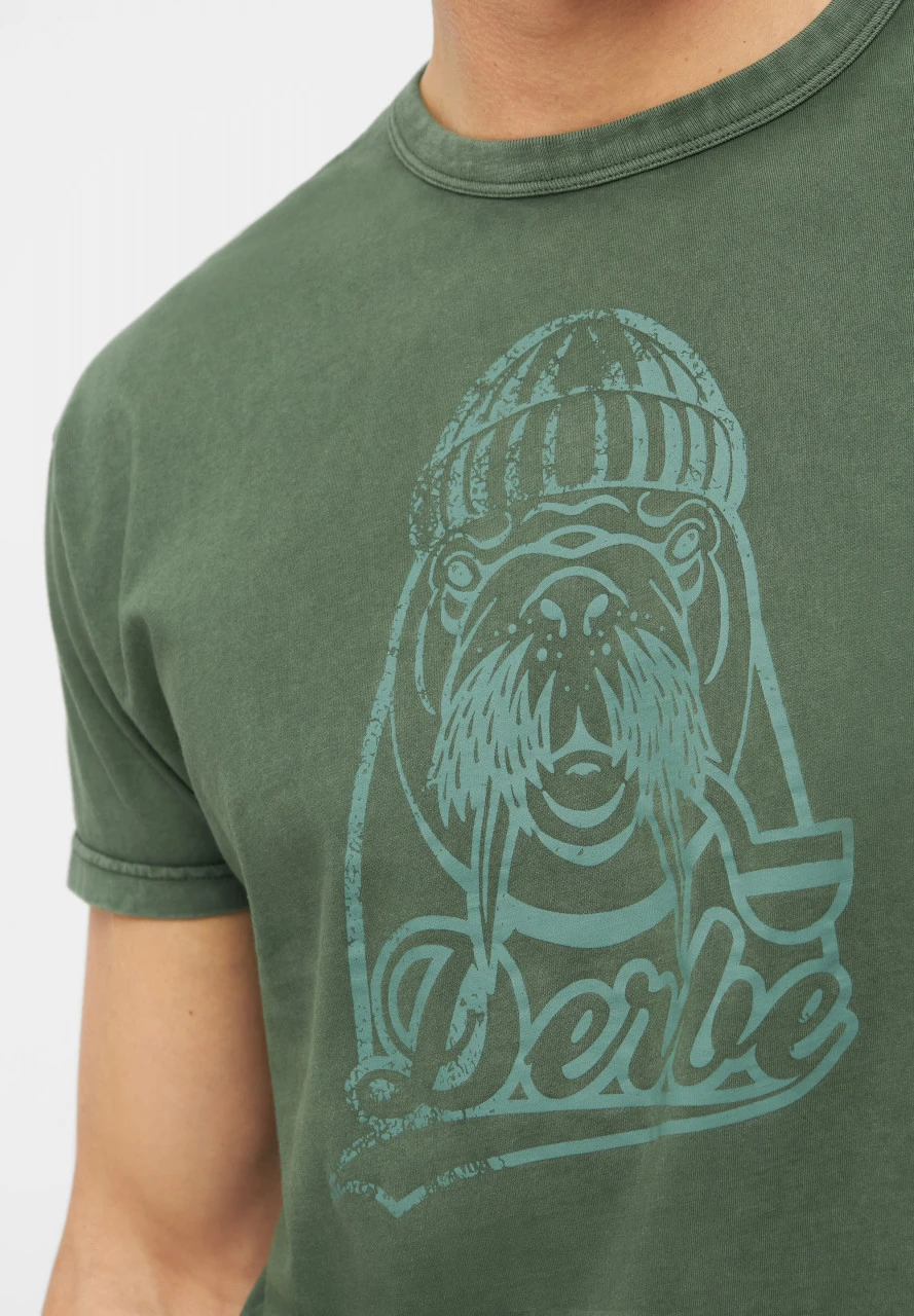 Grünes Motiv-Shirt im Washed Look von derbe mit einem großen Walross-Print für Herren.Nachhaltigkeit: