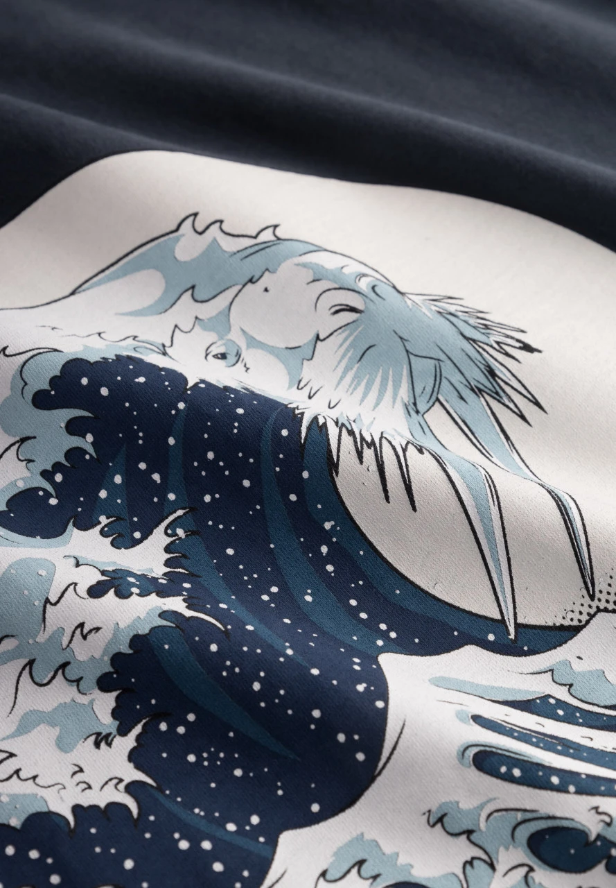 Blaues Damen T-Shirt von Derbe mit Kunst-Motiv. Kunst zum Anziehen – das Walross Motiv mit Leuchtturm ist eine Hommage an eine Hommage an Japan.Nachhaltigkeit: