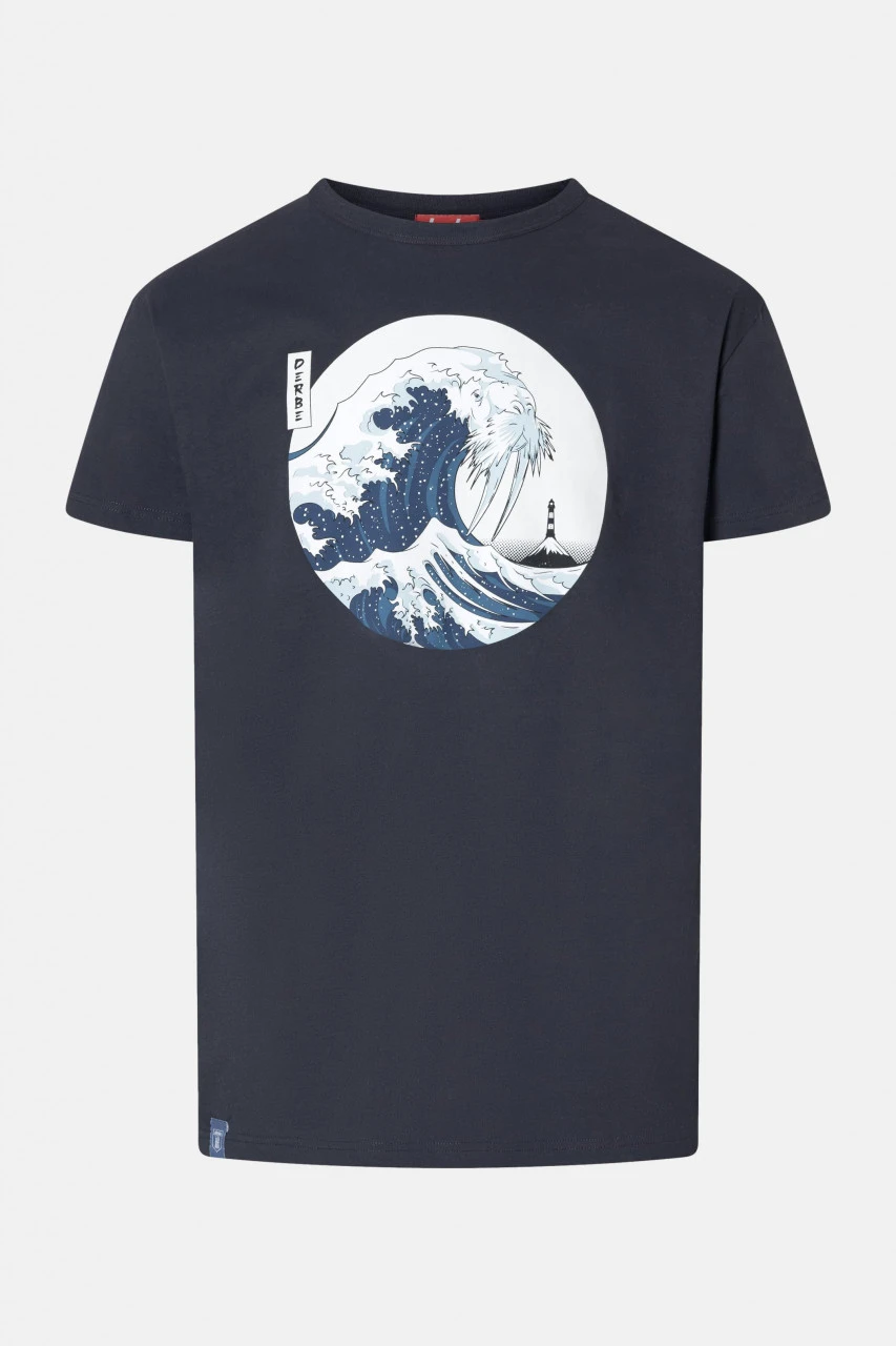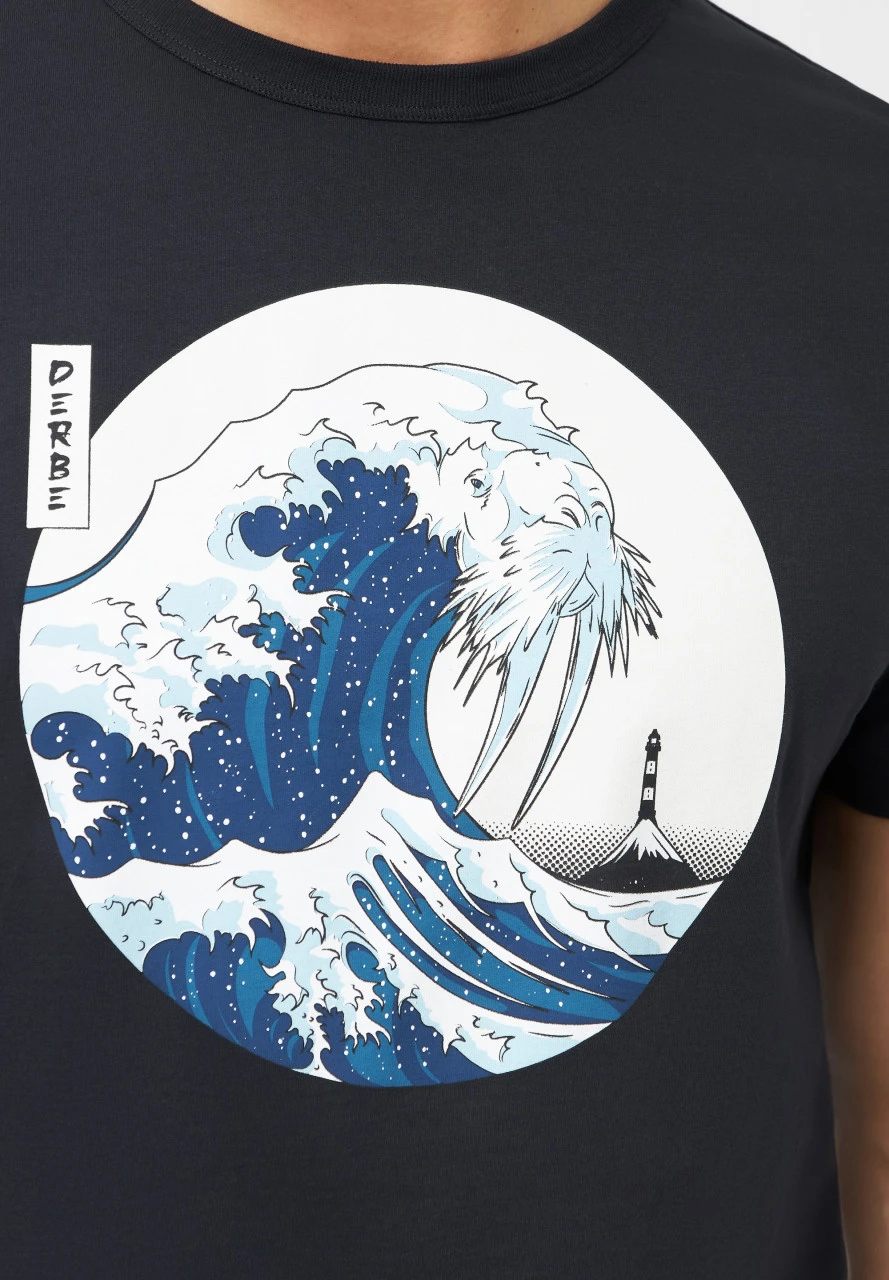 Schwarzes Herren T-Shirt von Derbe mit Wellen-Print. Kunst zum Anziehen – das Walross Motiv mit Leuchtturm ist eine Hommage an eine Hommage an Japan.Nachhaltigkeit: