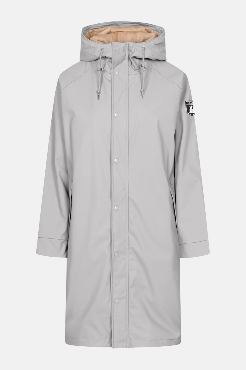 Hellgraue Regenjacke von derbe mit geradem Schnitt. Das Baumwoll-Innenfutter aus Kord in Beige ist super schick und sorgt zusätzlich für einen hohen Tragekomfort.Eigenschaften: