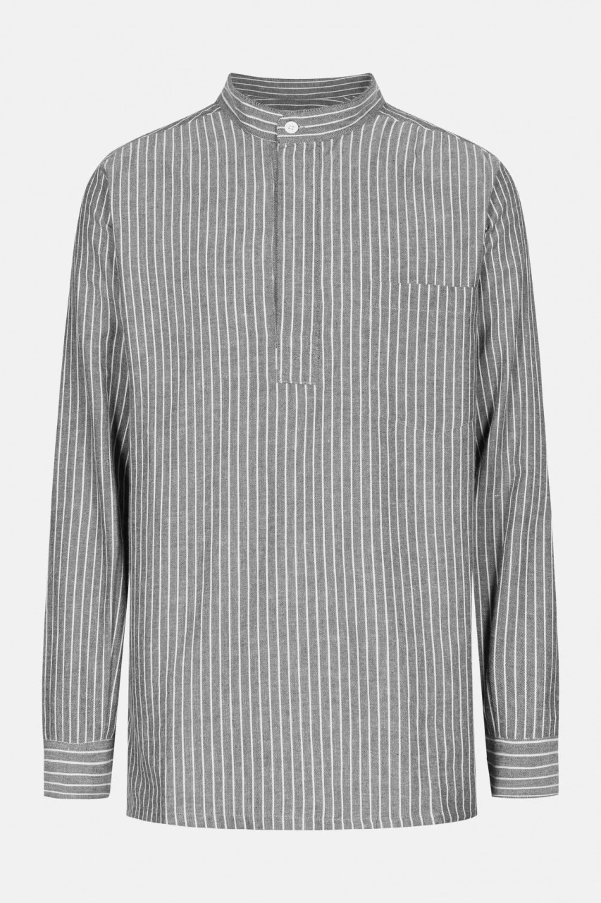 Gestreifter Eisenhans-Fischerhemd in grau. Verdeckte Knopfleiste. Die Fischerhemden von Eisenhans sind besonders locker geschnitten. Um eine gute Passform zu gewährleisten, empfehlen wir daher eine Nummer kleiner zu wählen.Größenhinweis: