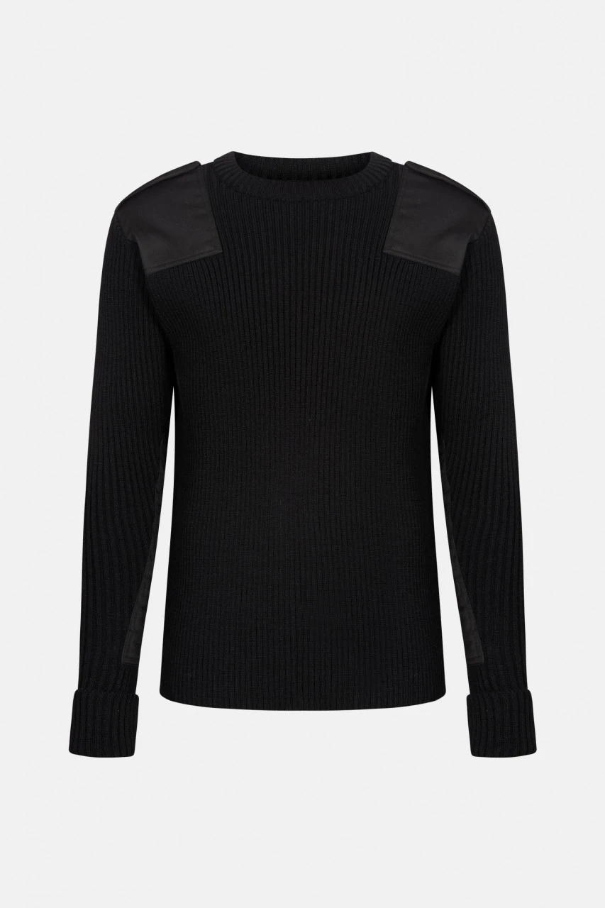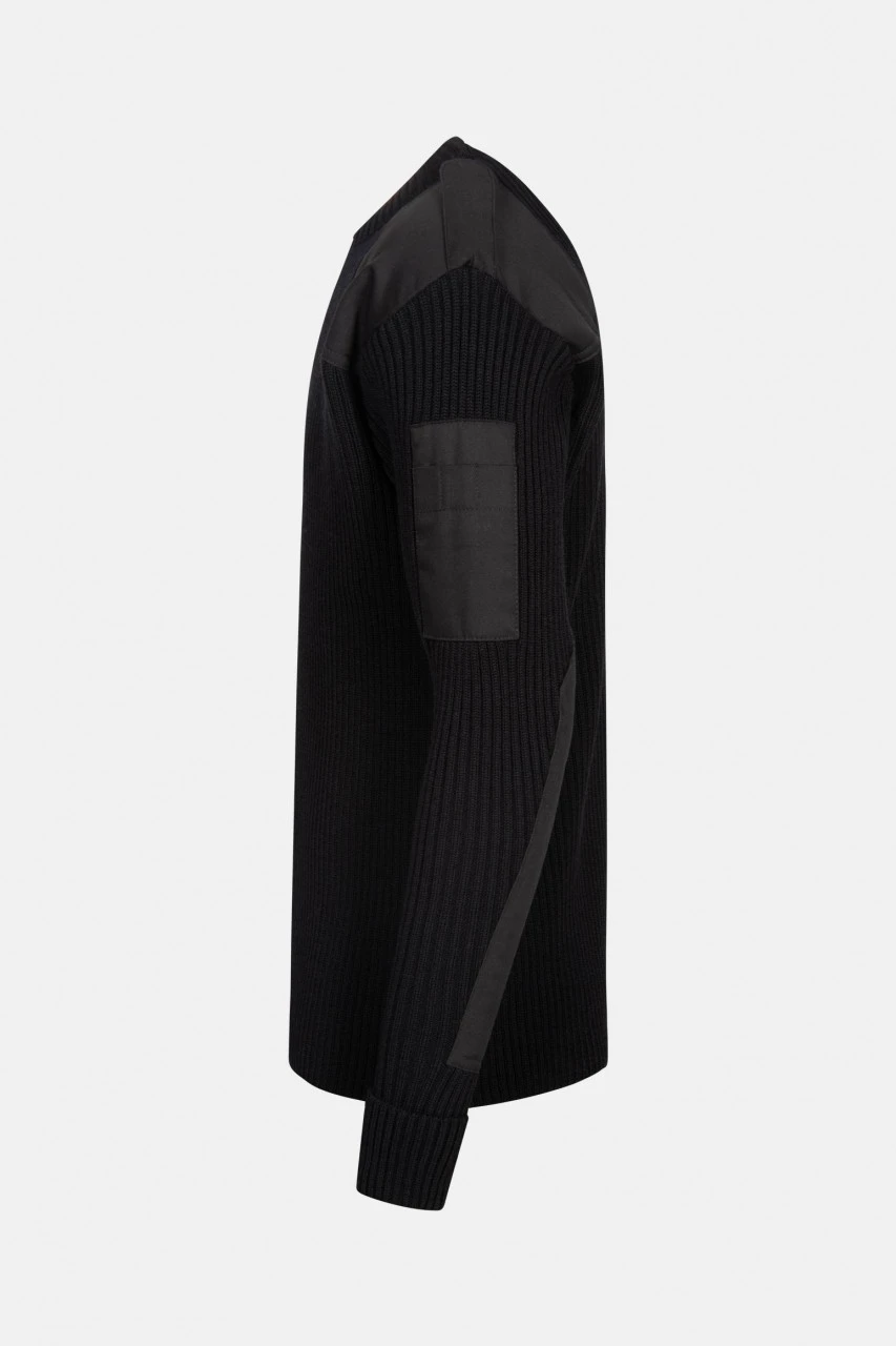 Klassischer Rippstrick Uniformpullover mit Klettverschluss-Besätzen auf den Schultern und aufgenähten Ärmelschonern. Die praktische Lasche auf dem linken Ärmel bietet Platz für drei Stifte.Eigenschaften: