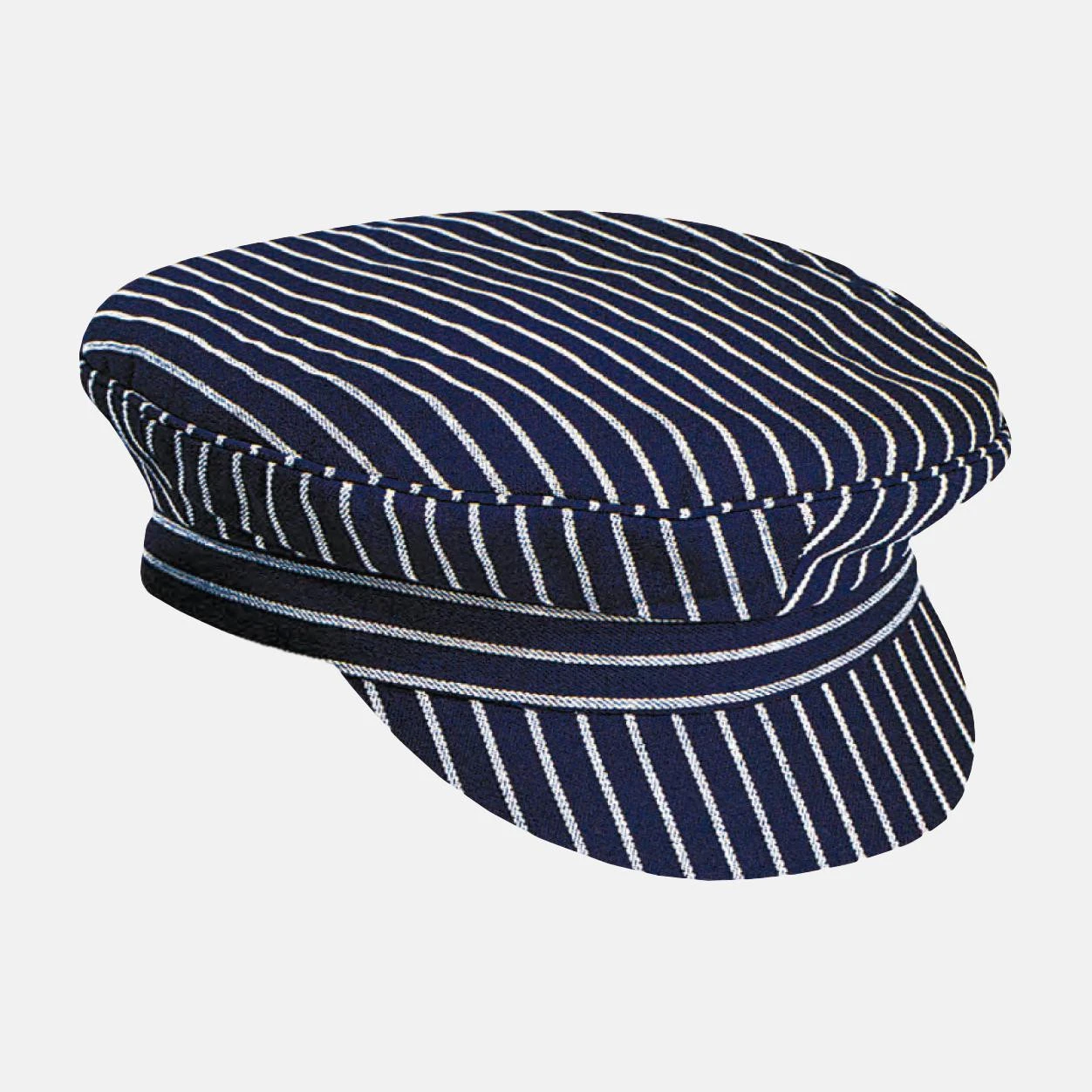 Klassisch gestreifter Elbsegler. Der Elbsegler ist eine schlichte, niedrige Schirmmütze mit einer Zierkordel vorn über dem Mützensteg. Üblicherweise gibt es den Elbseger in den Farben marine oder schwarz. In dieser Ausführung fällt die Kopfbedeckung allerdings einmal durch ein Streifenmuster auf.Hinweis: