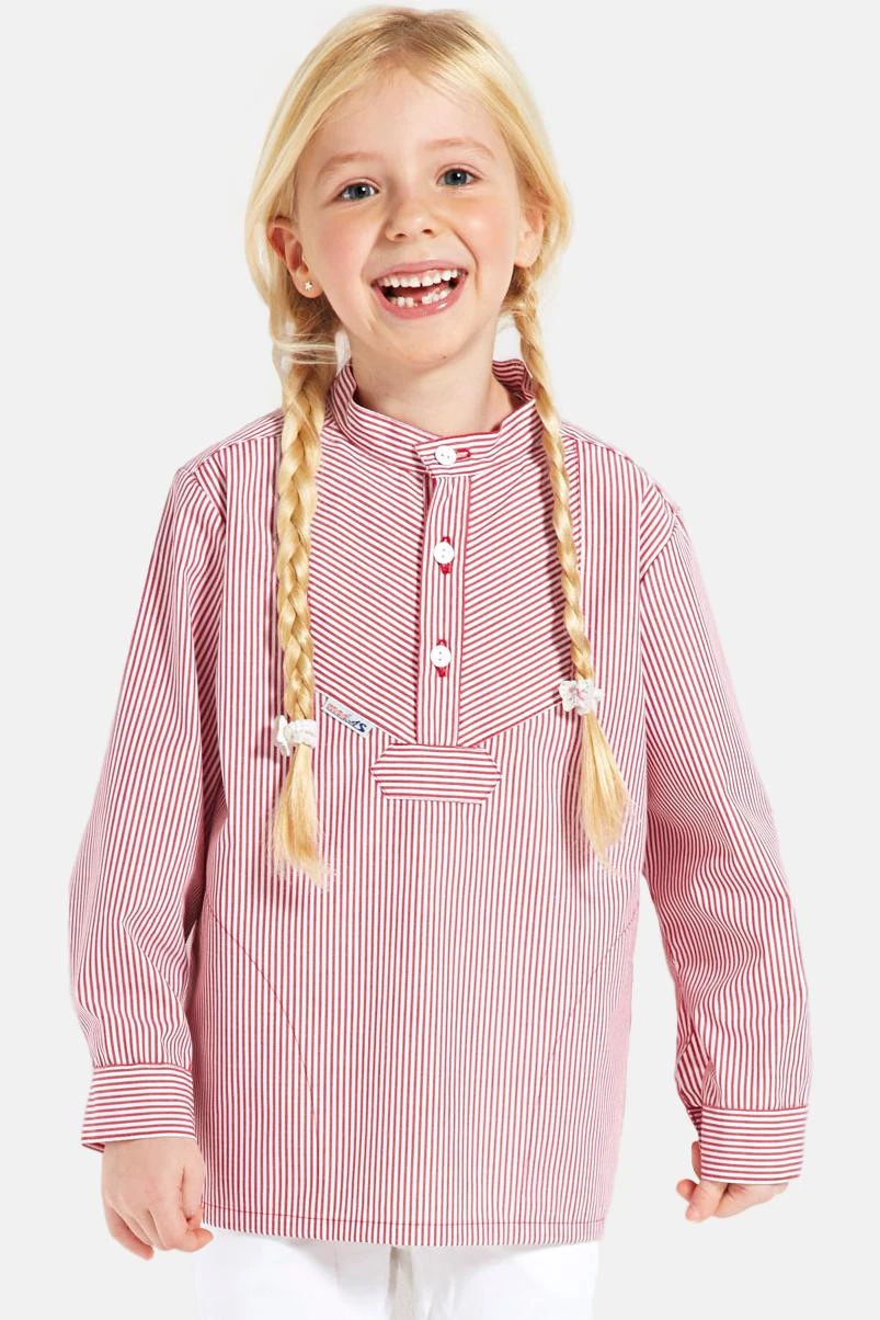 Unser Fischerhemd für Kinder im Finkenwerder-Stil in leuchtenden Farben aus buntgewebter, pflegeleichter Baumwollmischung. Das Hemd hat eine halbe Knopfleiste, zwei seitlich eingearbeitete Schubtaschen sowie Ärmelbündchen und Stehkragen.