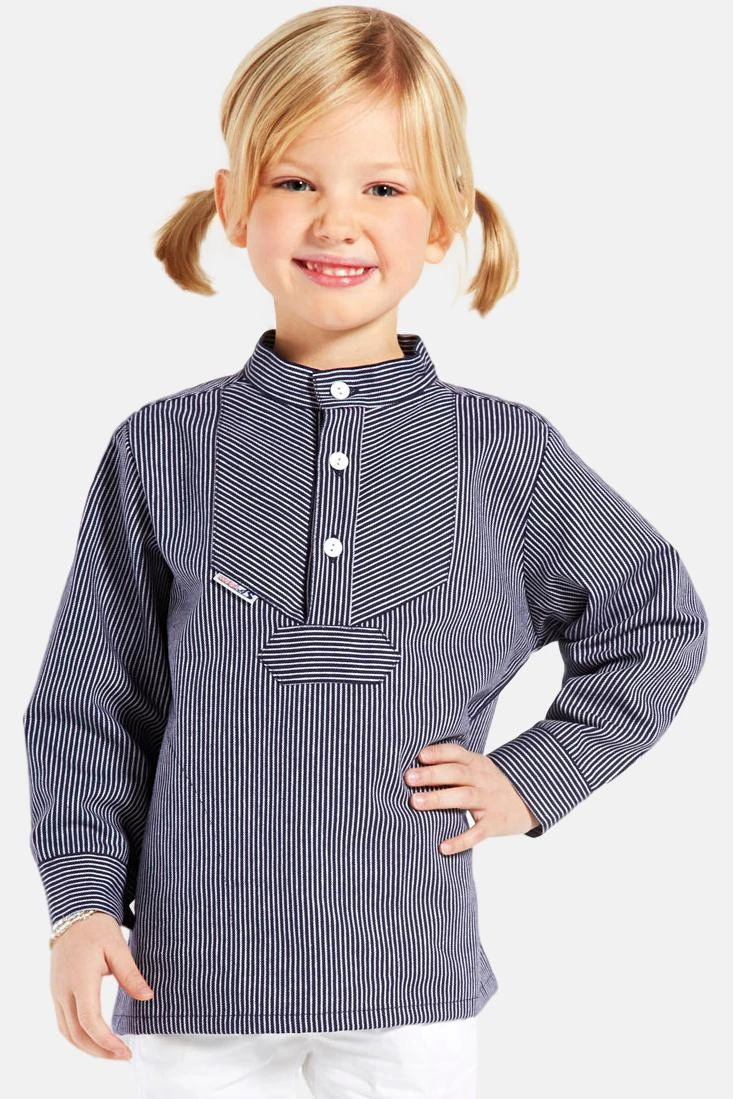 Wir führen das klassische Fischerhemd im traditionellen Finkenwerder-Stil auch in Kindergrößen. Das Kinderfischerhemd hat eine halbe Knopfleiste und verfügt über die typischen Ärmelbündchen und einen Stehkragen. Für Kinder ist das Material besonders geeignet, da das Hemd aus 100% Baumwolle besteht und somit keine unangenehmen Kratzeffekte auftreten. Das Besondere: Das Kinder-Fischerhemd hat zwei seitliche Einschubtaschen!