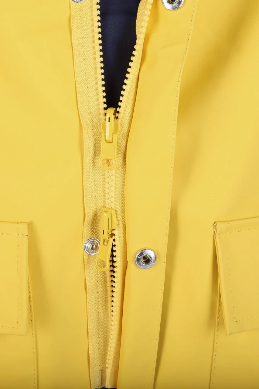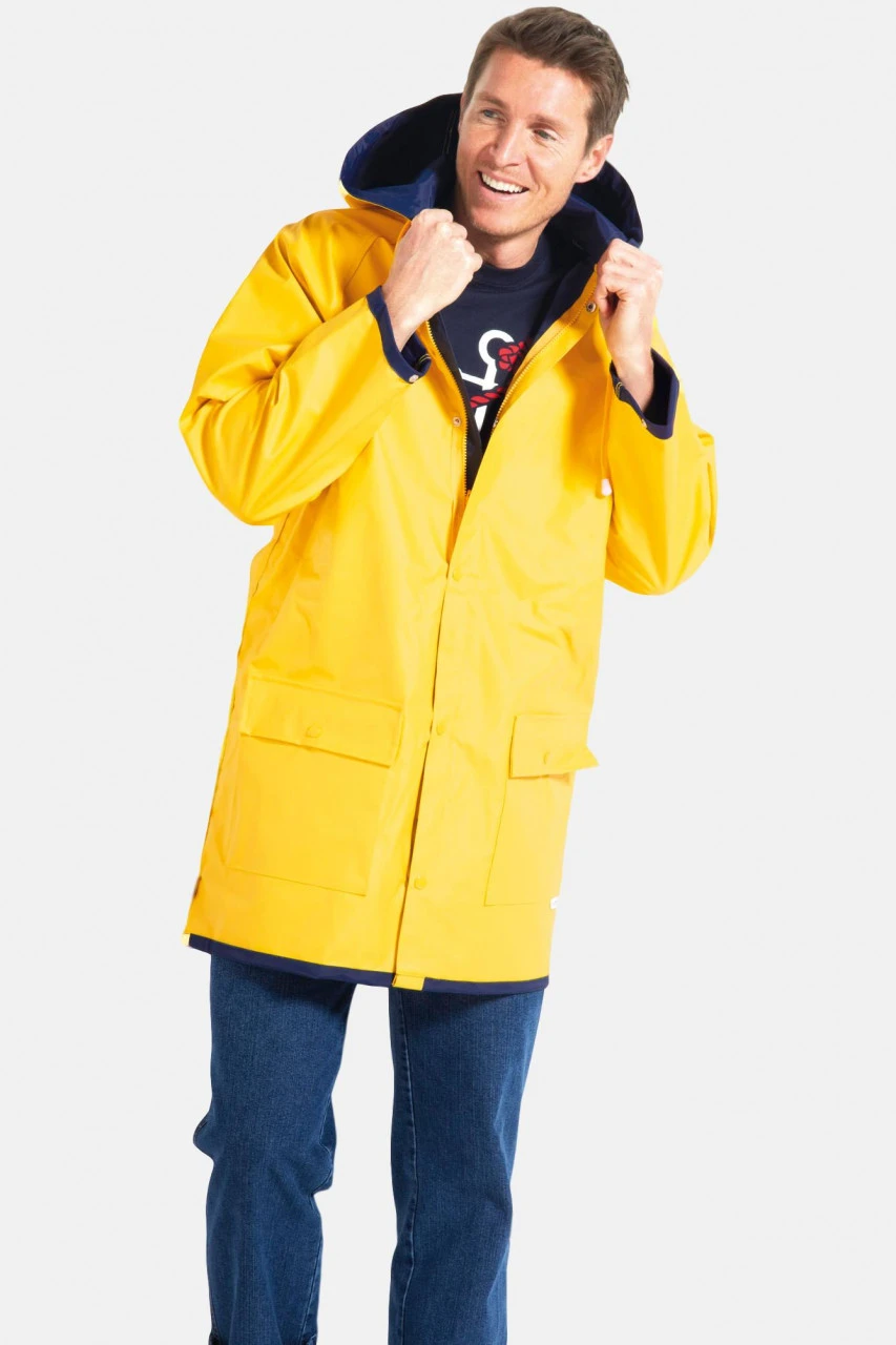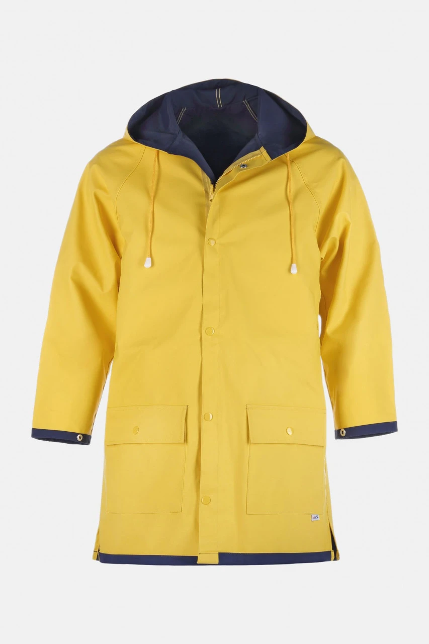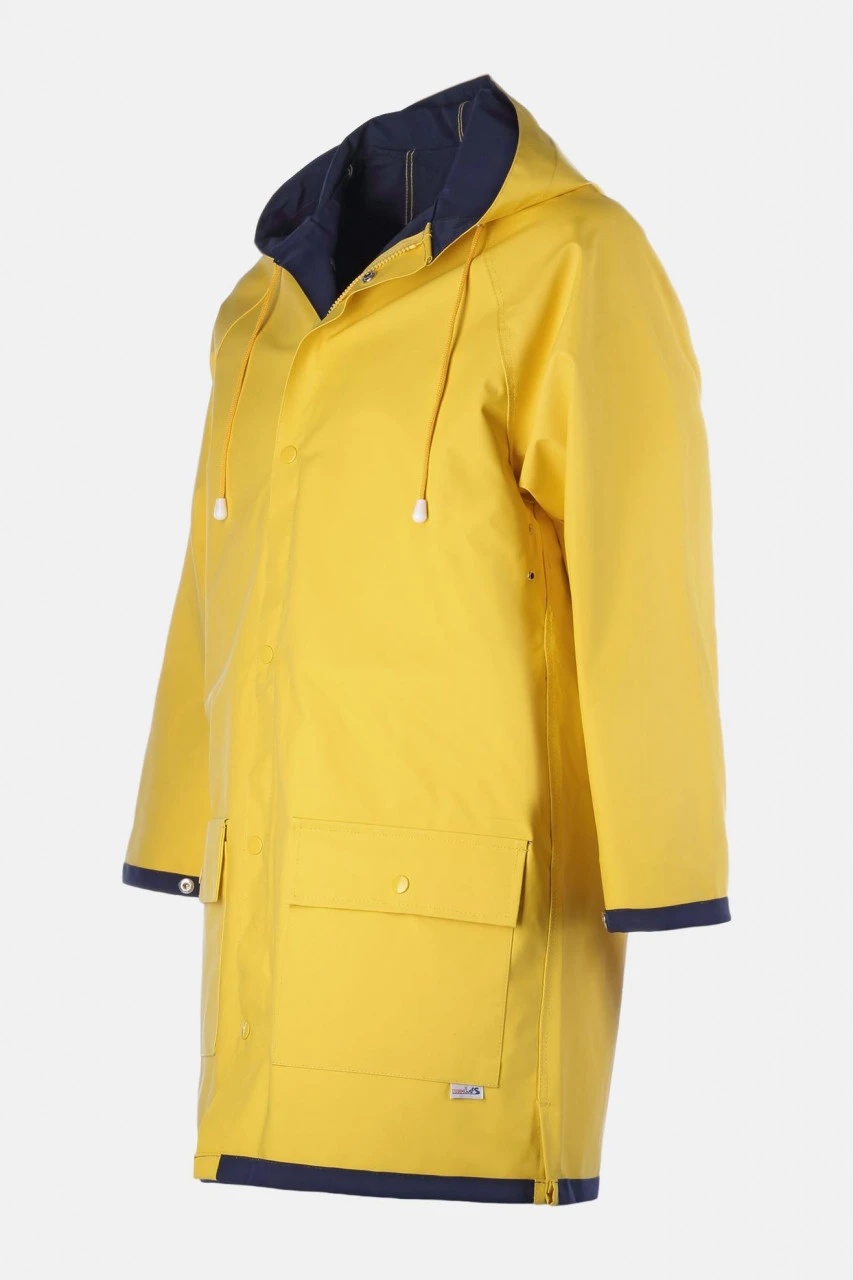 Da werden Kindheitserinnerungen wach. Der original Friesennerz liegt auch in dieser Saison wieder voll im Trend. Mit fester Kapuze, 2 aufgesetzten Pattentaschen und stabilen Druckknöpfen. Absolut wasser- und winddicht. Aus wasserdichtem Spezialgewebe. Wendefunktion. Außen gelb – innen blau.Größenhinweis:
