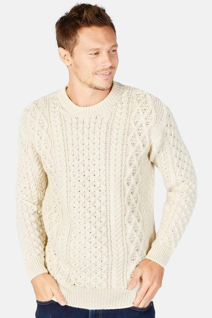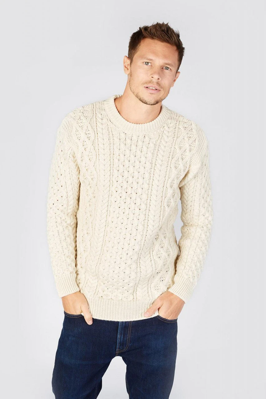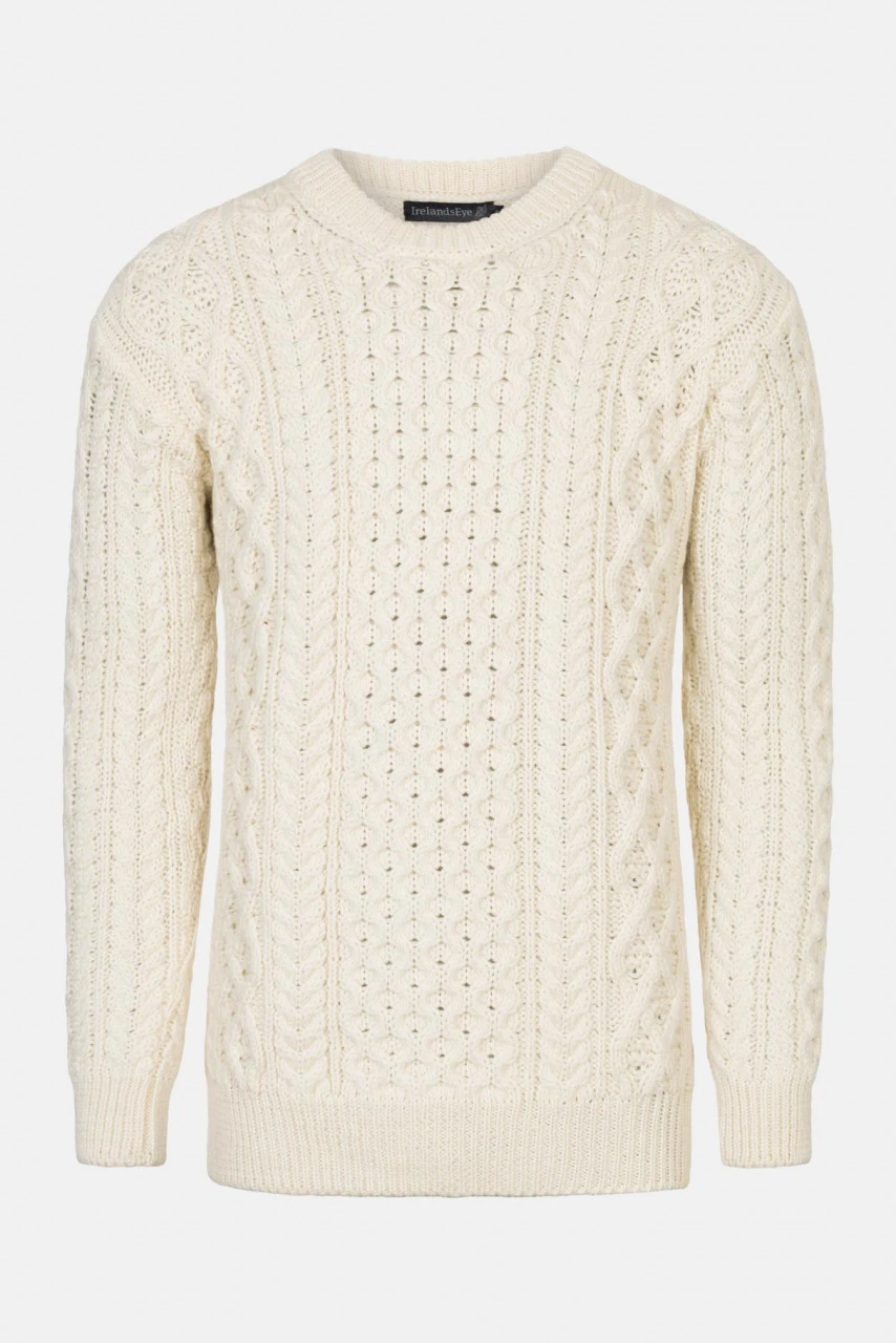 Klassischer Merino Schurwoll Strick Pullover mit detailreichem Aran-Muster in Woll Weiß. Für dieses Modell hat Irelands Eye den Aran neu interpretiert und die klassischen Blasket und Honeycomb Muster kombiniert. Diese Strickmuster stehen traditionell, in Anlehnung an die Körbe der Fischer, für Erfolg und inspiriert von den Bienen, die harte Arbeit die dahinter steckt.