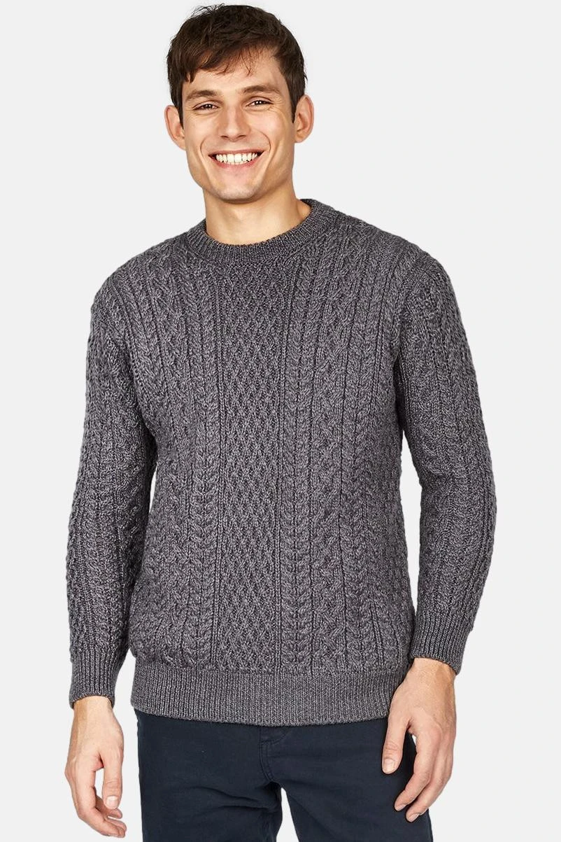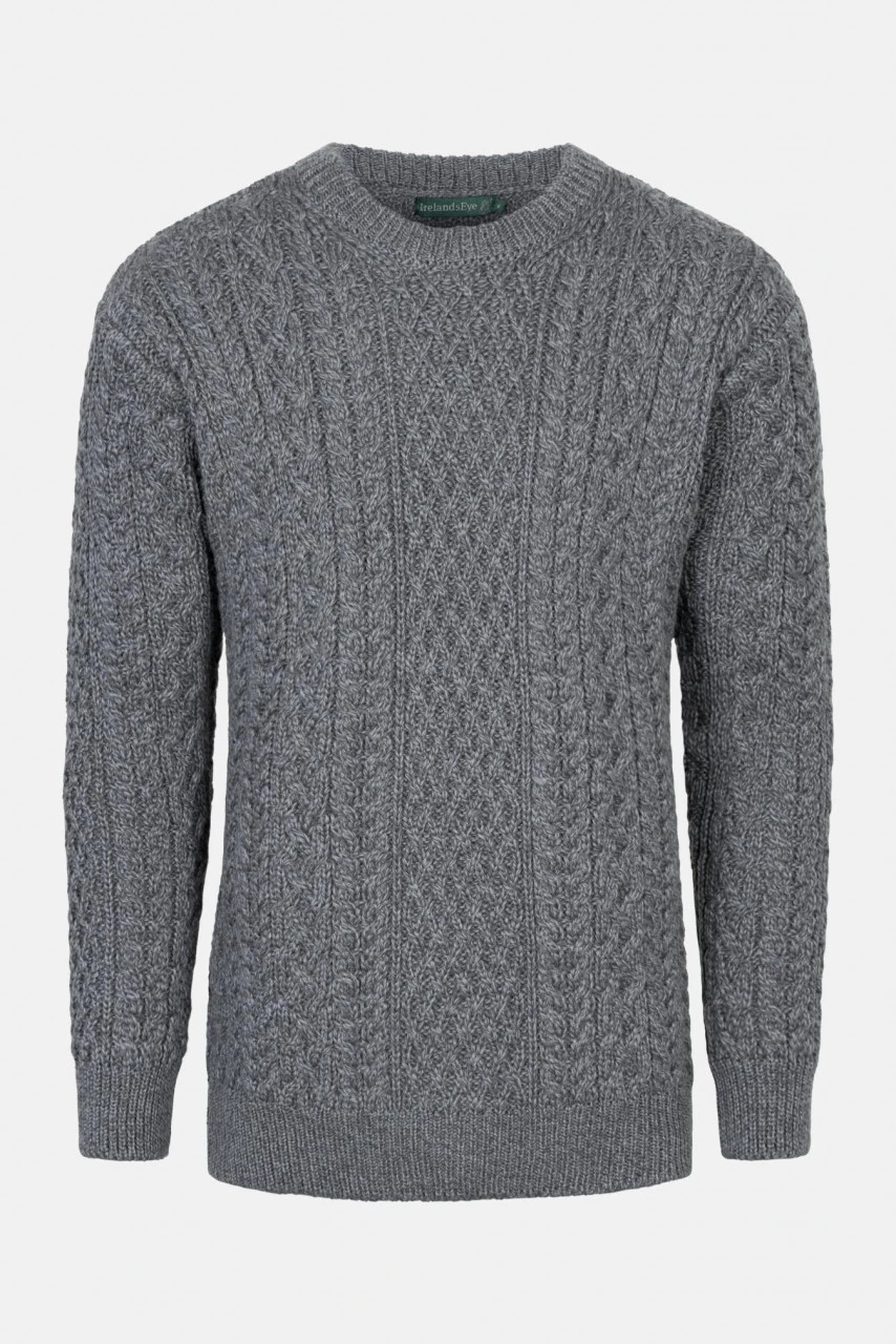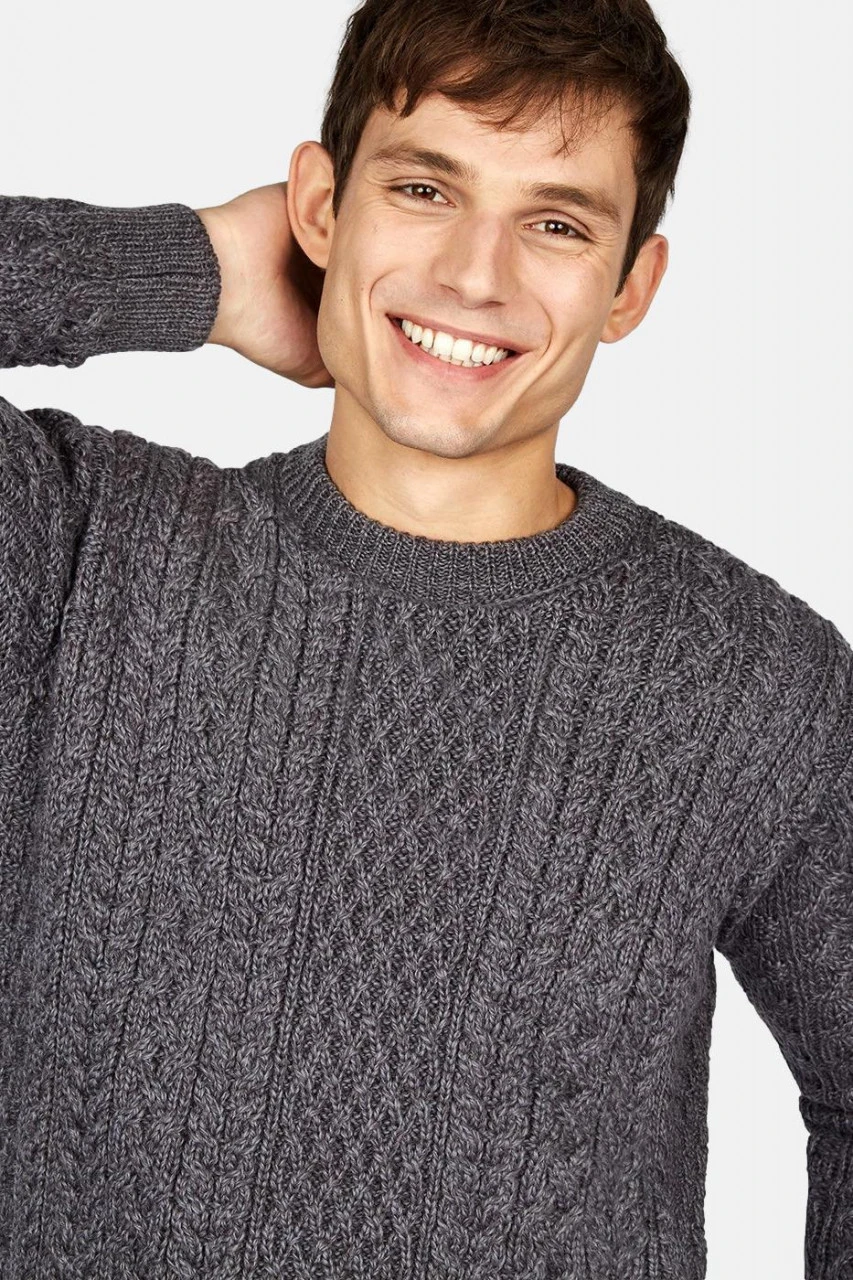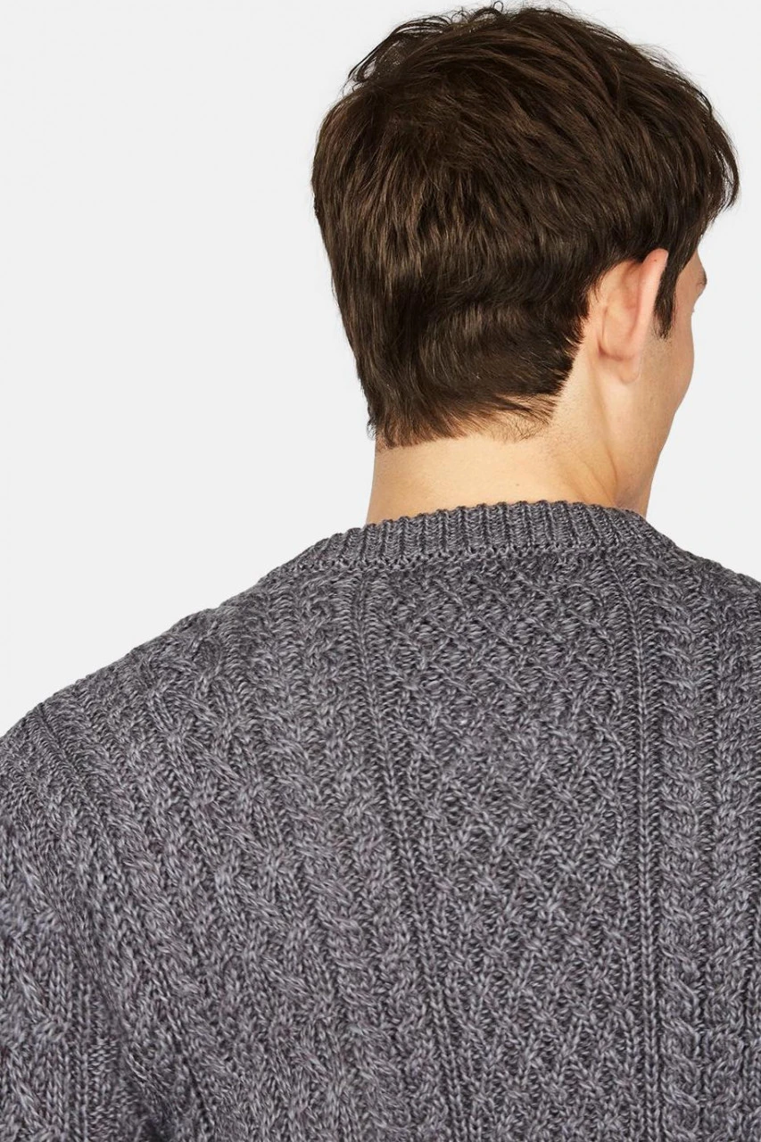Klassischer Merino Schurwoll Strick Pullover mit detailreichem Aran-Muster in Grau Melange. In Irland gefertigt, ist dieser Pullover Teil einer langen Tradition. Das Zopfstrickmuster auf diesem Pullover ist den Seilen der Fischer nachempfunden und die warme Wolle das ideale Material um dem rauen Wind zu trotzen.