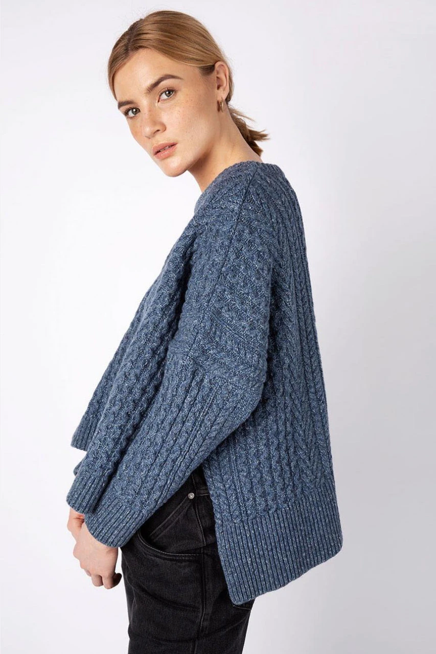 Moderner Strick-Pullover für Damen mit detailreichem Aran-Muster in Blau Melange. Für dieses Modell hat Irelands Eye den Aran neu interpretiert und mit viel Liebe zum Detail in Irland gefertigt. Neben dem klassischen Zopfmuster, das für die Seile der Fischer steht besticht dieser Pullover auch durch das Tree of Life Strickmuster, das traditionell für ein langes Leben und die Familie steht. Dieser schöne Pullover ist sehr locker und gerade geschnitten. Durch die überschnittenen Schultern, die seitlichen Schlitze und den nach hinten verlängerten Schnitt wirkt dieses Modell besonders modern und kann vielseitig zu Röcken und Hosen kombiniert werden. Die Schurwoll-Mischung mit Baumwolle, Kaschmir und Seide ist besonders angenehm auf der Haut und macht diesen Strickpulli zum idealen Begleiter für die Übergangszeit.Größenhinweis: