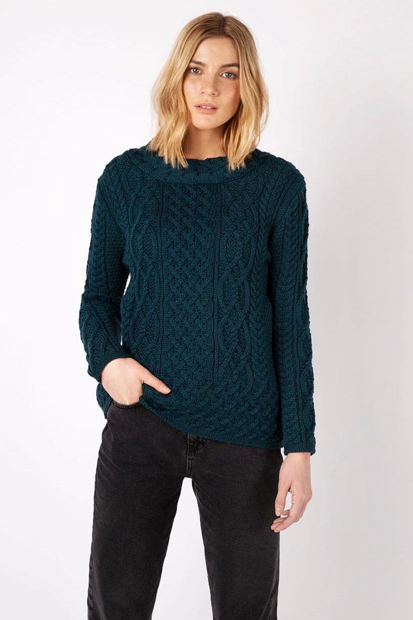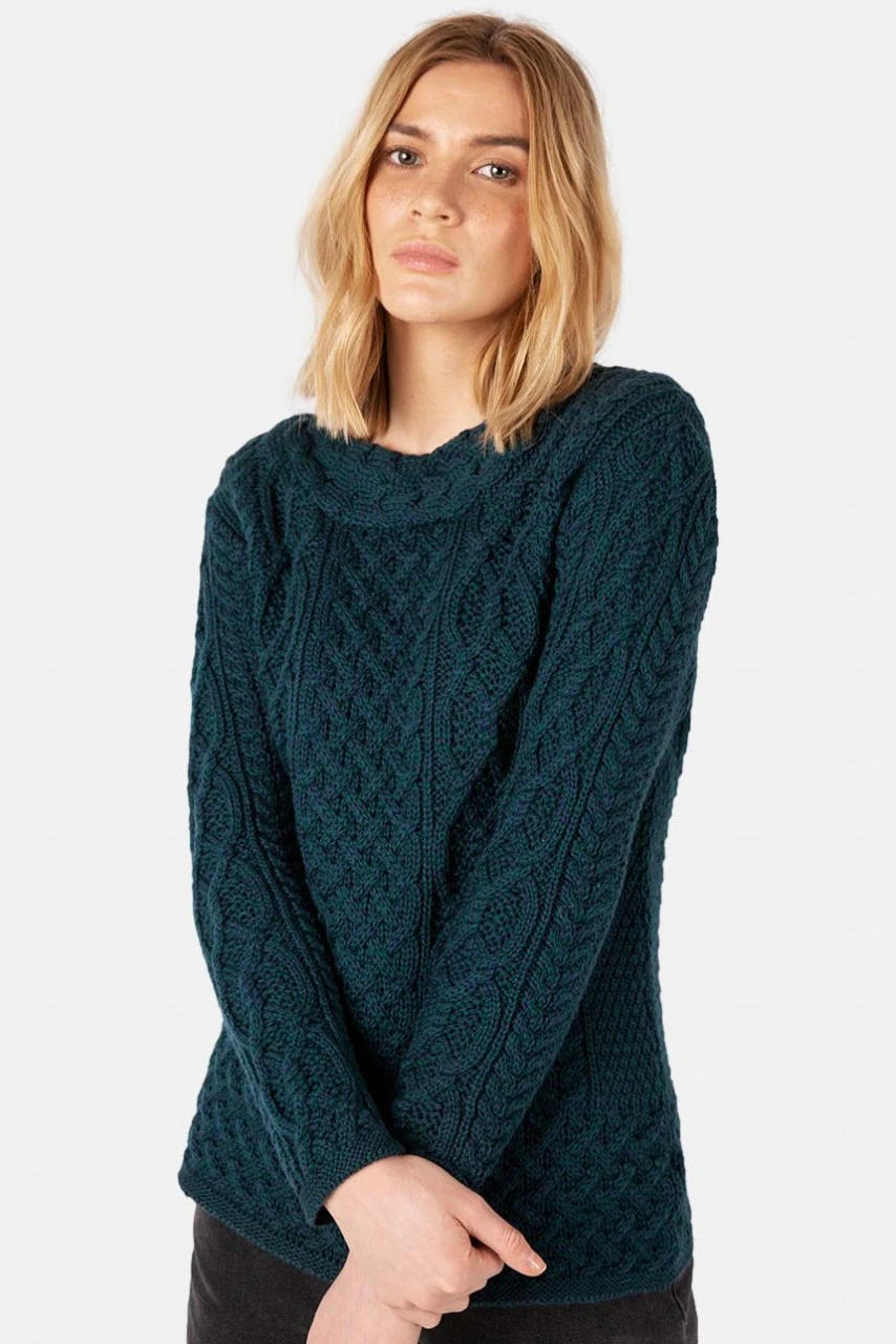 Femininer Schurwoll Strick Pullover aus Merinowolle mit detailreichem Aran-Muster in Blau mit Grün meliertem Garn. Für dieses Modell hat Irelands Eye eine Vielzahl der klassischen Strickmuster der Aran-Muster kombiniert. Ein besonderes Highlight ist dabei das verschlungene Seil-Muster am Rundhalsausschnitt. Dieses Zopfstrickmuster ist den Seilen der Fischer nachempfunden und wird im Pullover wieder aufgegriffen. Das klassische Blasket Korb-Muster steht für Erfolg, während das Moss Perl-Muster die Natur und der Diamanten-Stich Reichtum repräsentiert.