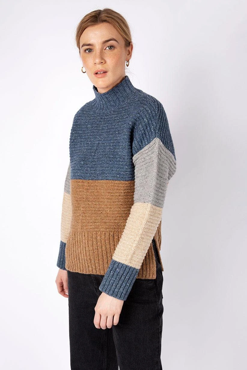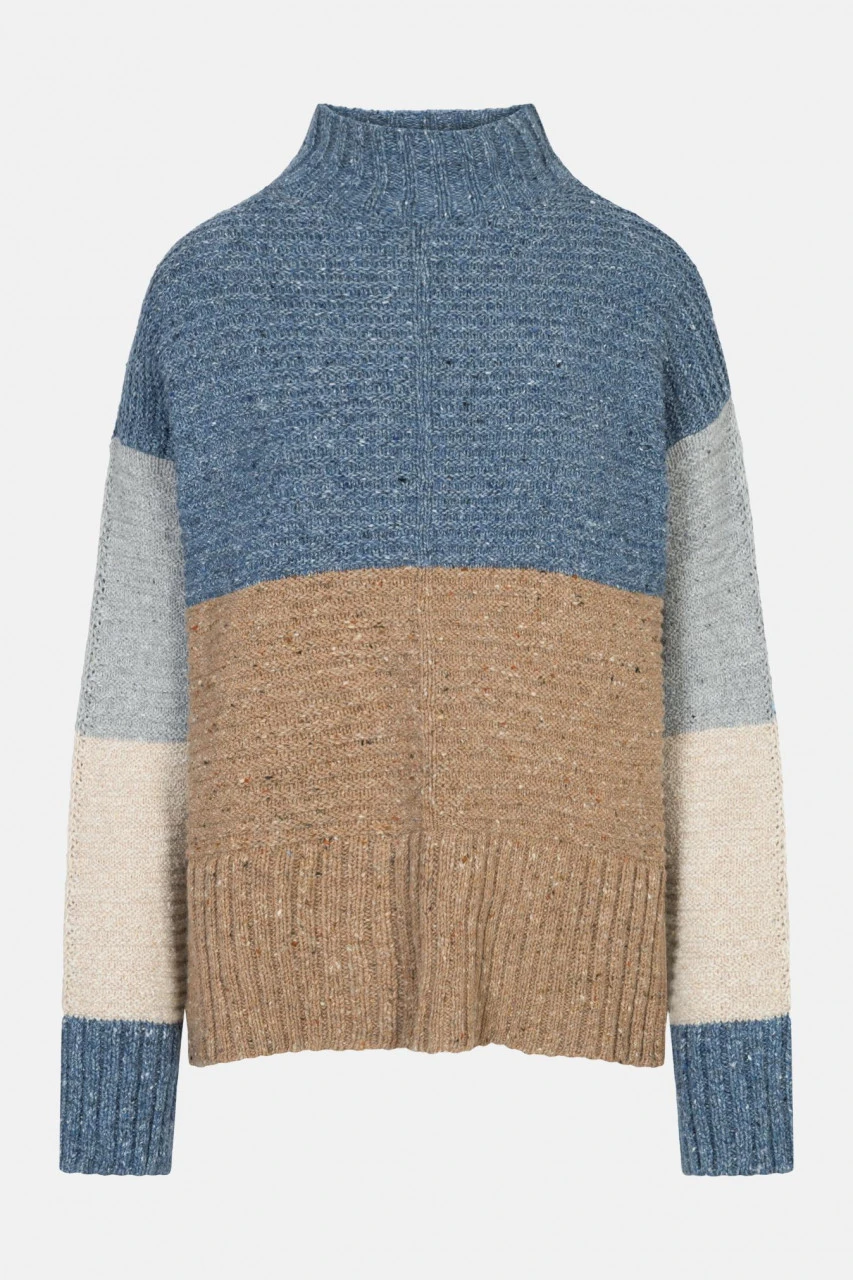Strick-Pullover von Irelands Eye mit Color Blocking in Blau, Beige und Braun. Dieser schöne Pullover ist sehr locker und gerade geschnitten. Durch die überschnittenen Schultern und seitliche Schlitze wirkt dieses Modell besonders modern und kann vielseitig zu Röcken und Hosen kombiniert werden. Der hohe Stehkragen schützt vor kaltem Wind während die Schurwoll-Mischung mit Baumwolle, Kaschmir und Seide besonders angenehm auf der Haut ist. Ein idealer Begleiter für die Übergangszeit der mit viel Liebe zum Detail in Irland gefertigt wird.Größenhinweis: