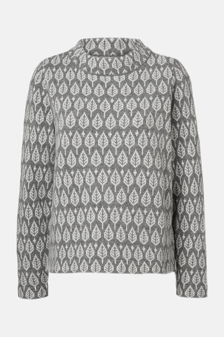 Mit viel Liebe zum Detail wird der warmer Lammwoll-Pullover Sarali von Jumperfabriken zu einem echten Lieblingsstück. Das eingestrickte graue Blättermuster findet in Kombination mit dem geraden 60s Schnitt die perfekte Balance zwischen Vintage und Moderne.