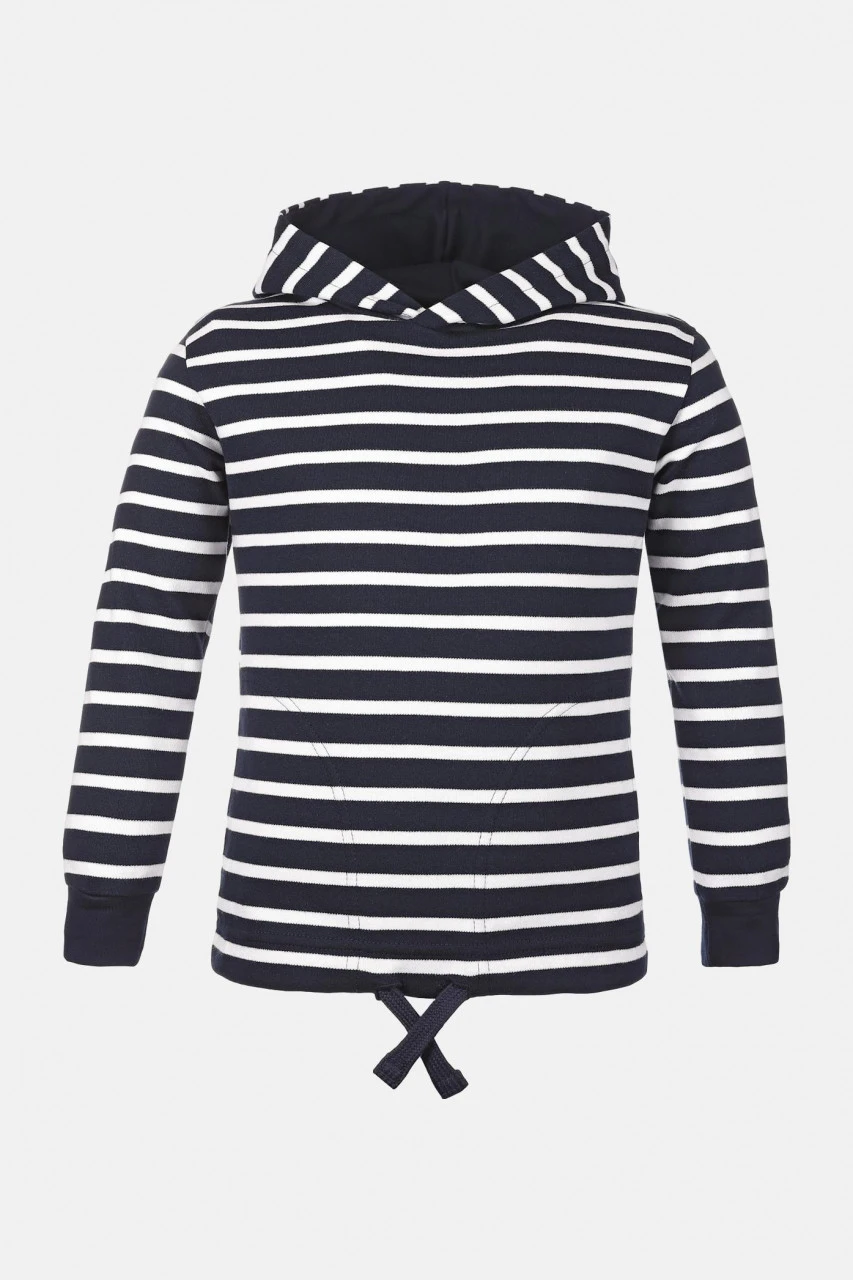 Bretonisches Kinder-Kapuzenshirt. Der schicke Kapuzi ist für Freizeit und Sport oder die etwas windigeren Tage an der See geeignet. Die hochangesetzte Kapuze und der Bundabschluss sind verstellbar mit Kordelzug, die unifarbenen Ärmelbündchen sind angenehm elastisch. Zwei Seitentaschen und hundertprozentige Baumwolle machen das Shirt zu einem richtigen Wohlfühlteil. Bis Größe 140 ersetzen aus Sicherheitsgründen ein elastischer Gummizug und ein Knopf mit Kordelschlaufe den Kordelzug in der Kapuze.