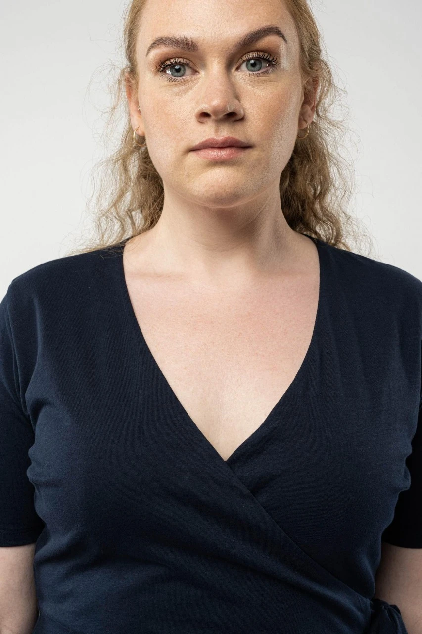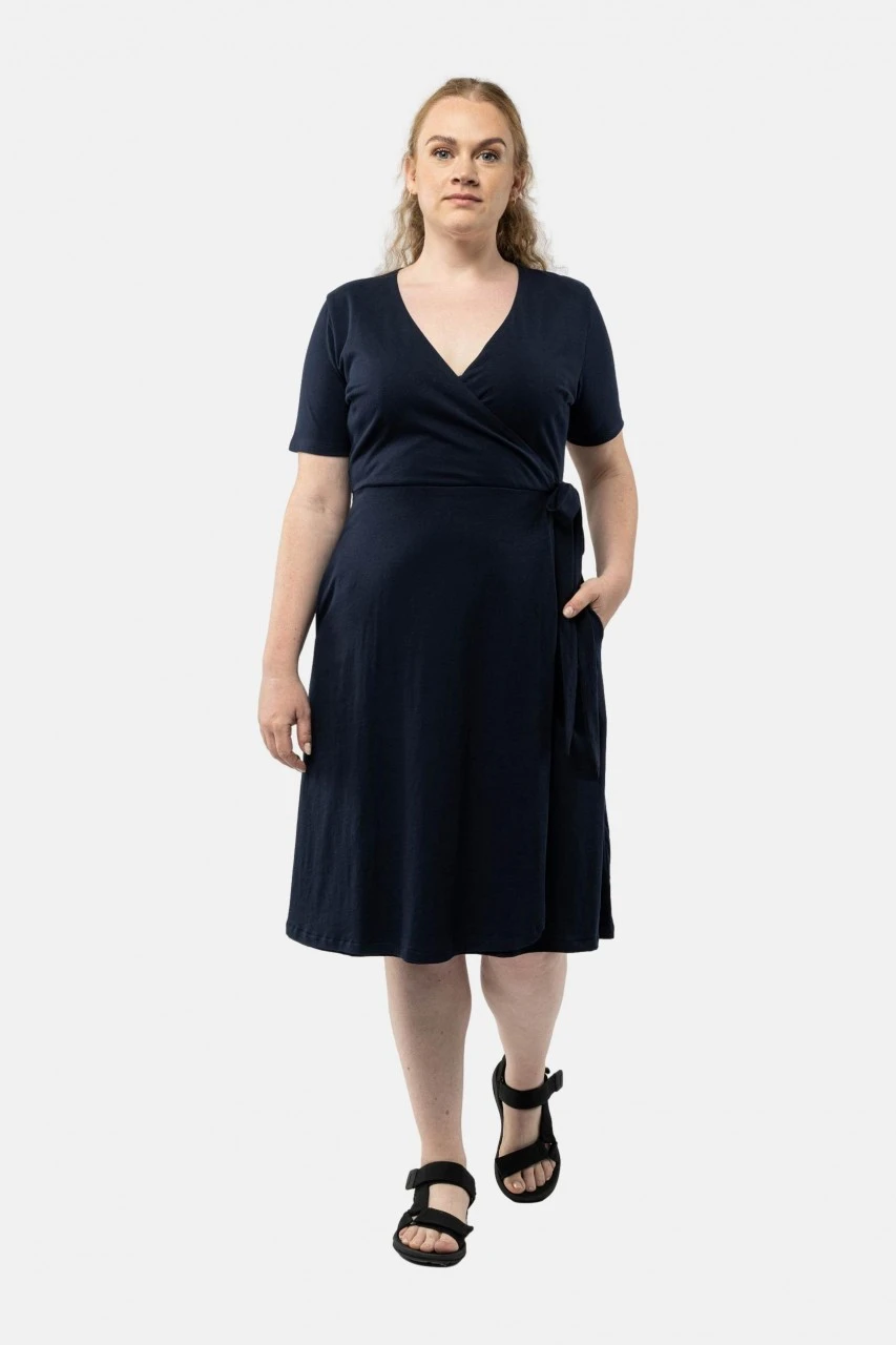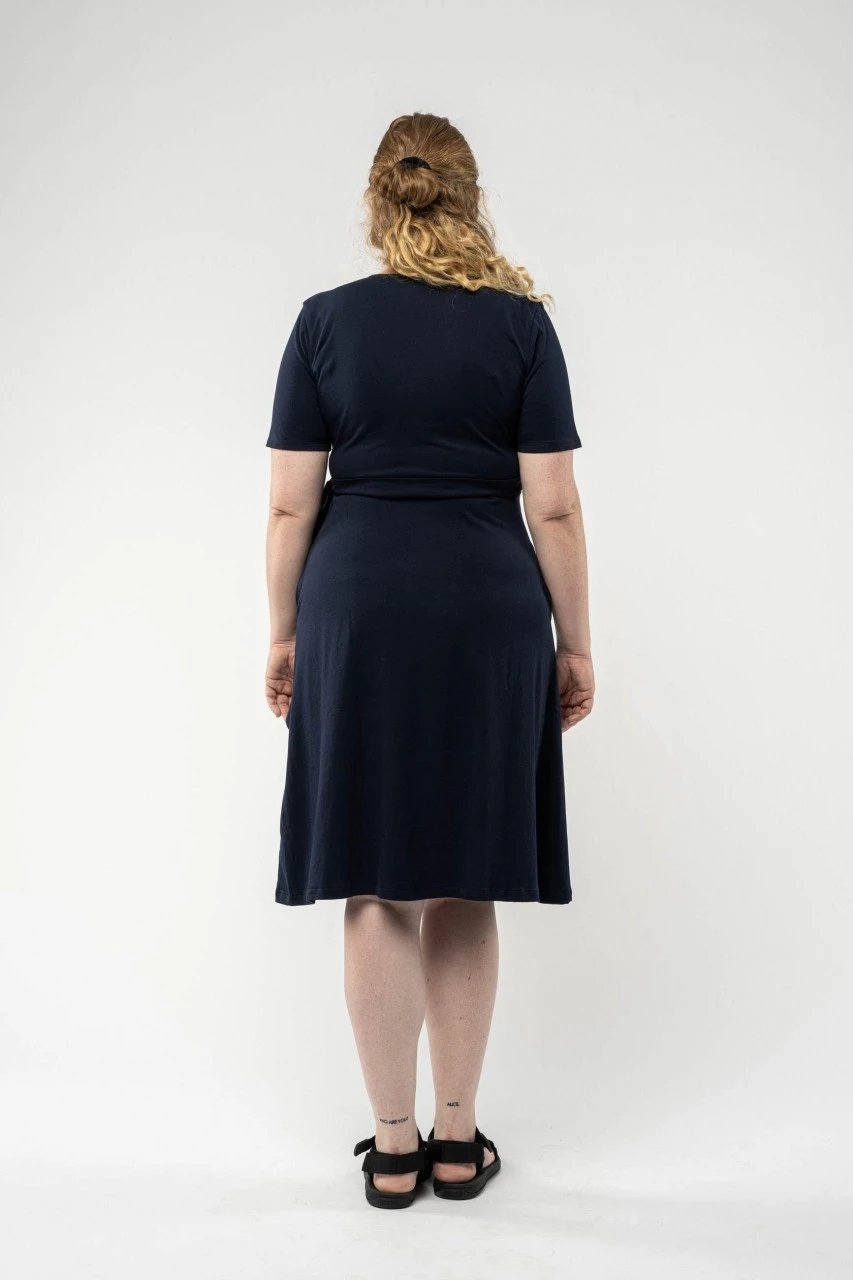 Leichtes Kurzarm-Wickelkleid von MELA in Dunkelblau mit Taillengürtel.Eigenschaften: