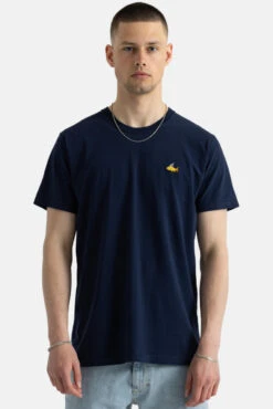 Dunkelblaues T-Shirt von Revolution für Herren mit raffiniertem Stick auf der Brust. Garantiert Angsteinflößend – der gestickte Goldfisch hat sich als Hai verkleidet und die passende Rückenflosse umgebunden.Nachhaltigkeit: