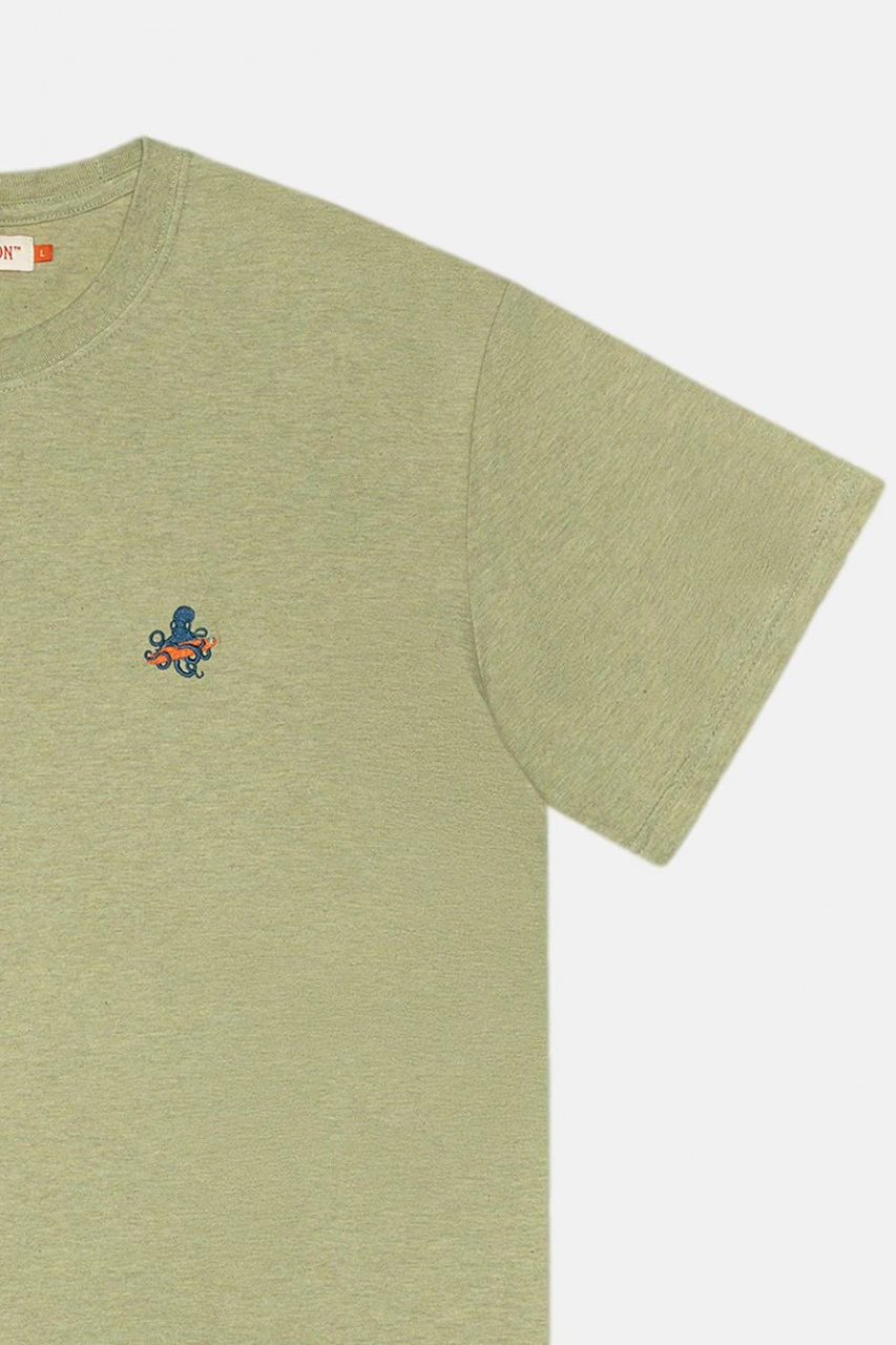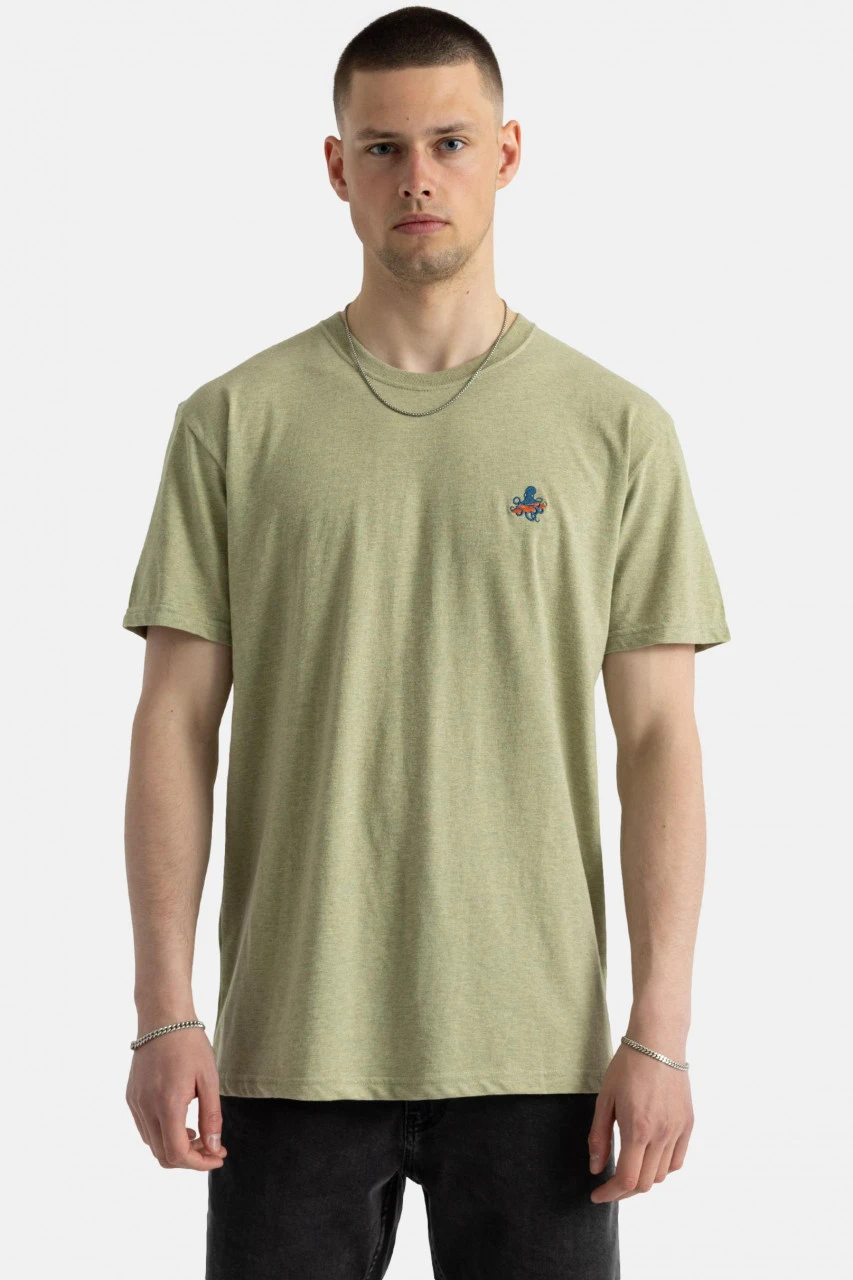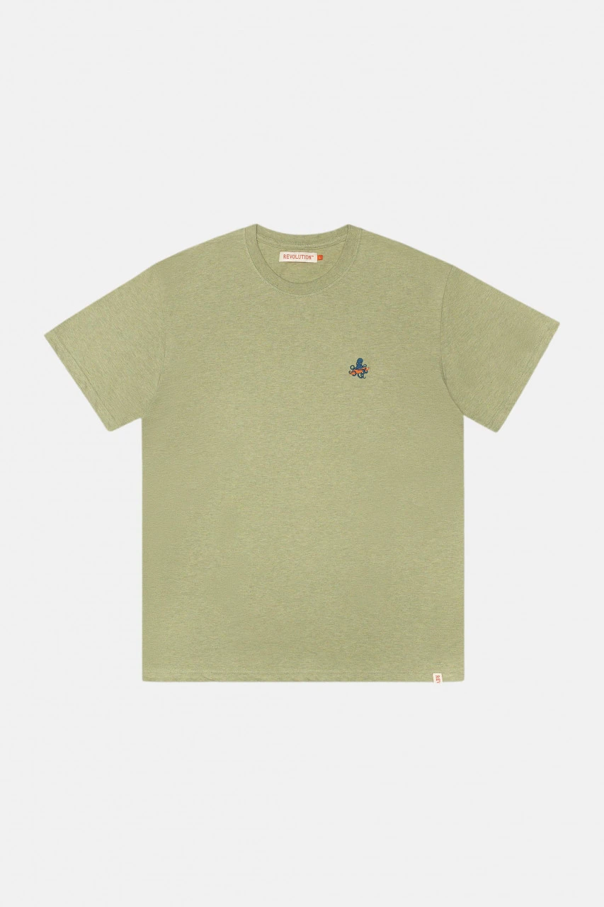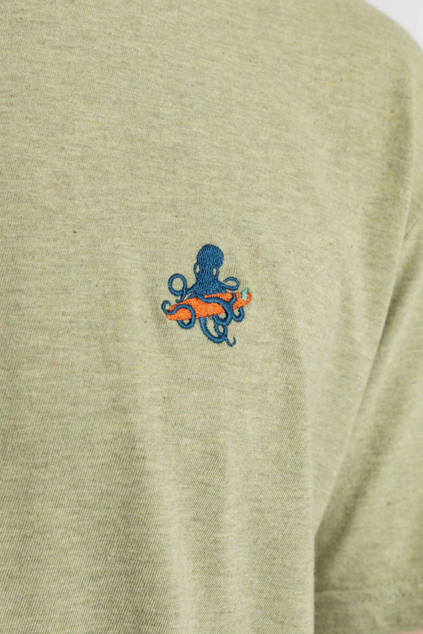 Hellgrünes T-Shirt von Revolution für Herren mit raffiniertem Stick auf der Brust. Das wird garantiert eine wilde Fahrt – Über der Brusttasche scheint sich ein Tintenfisch für eine Runde auf dem Surfbrett bereit zu machen!Nachhaltigkeit: