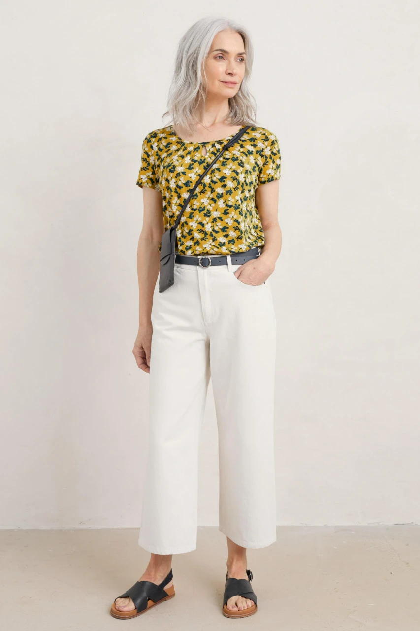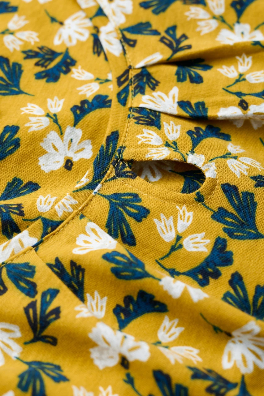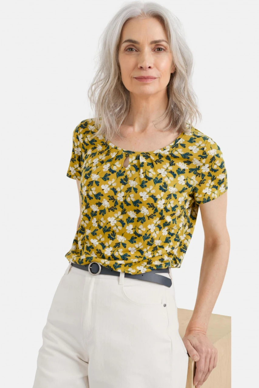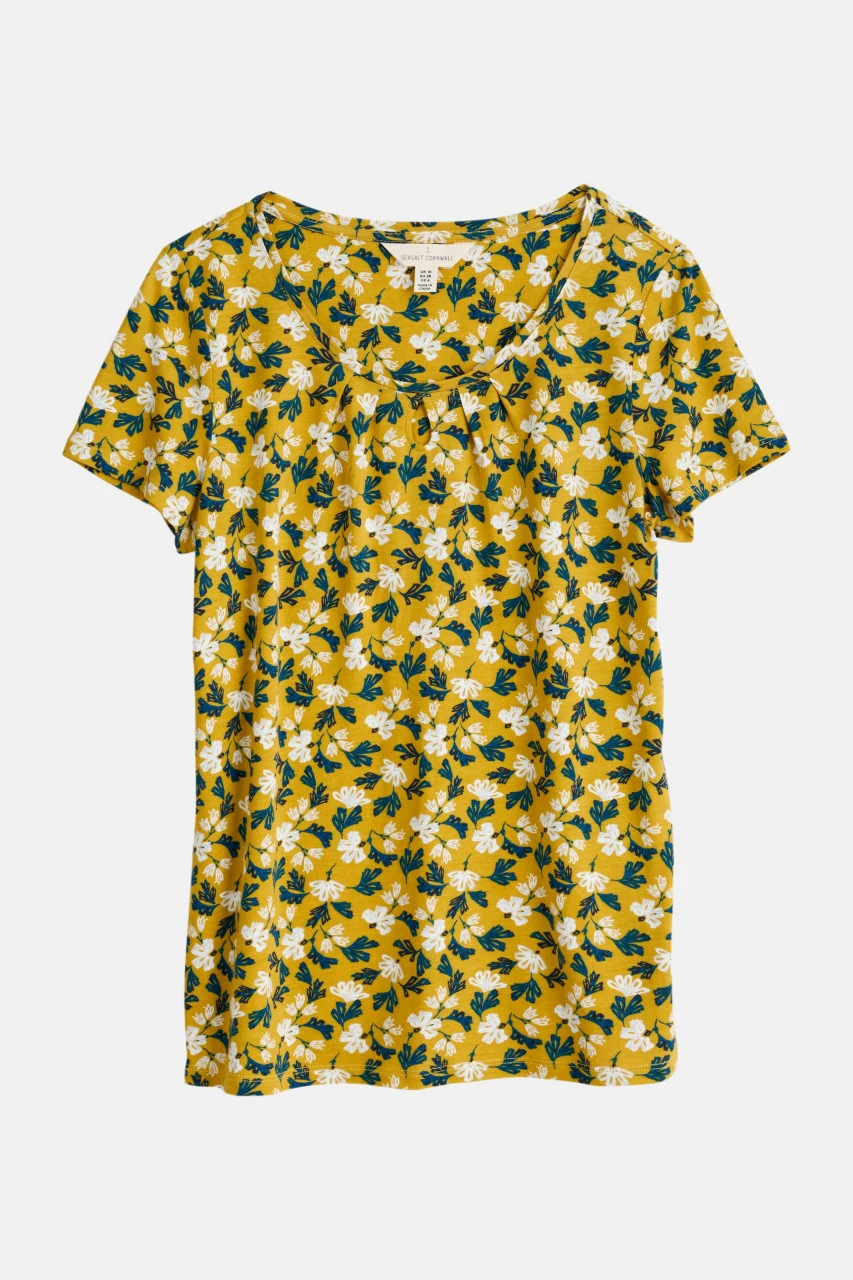 Leichtes Damen Shirt von Seasalt Cornwall mit raffiniertem Kragen und floralem Muster in Gelb und Weiß.Eigenschaften: