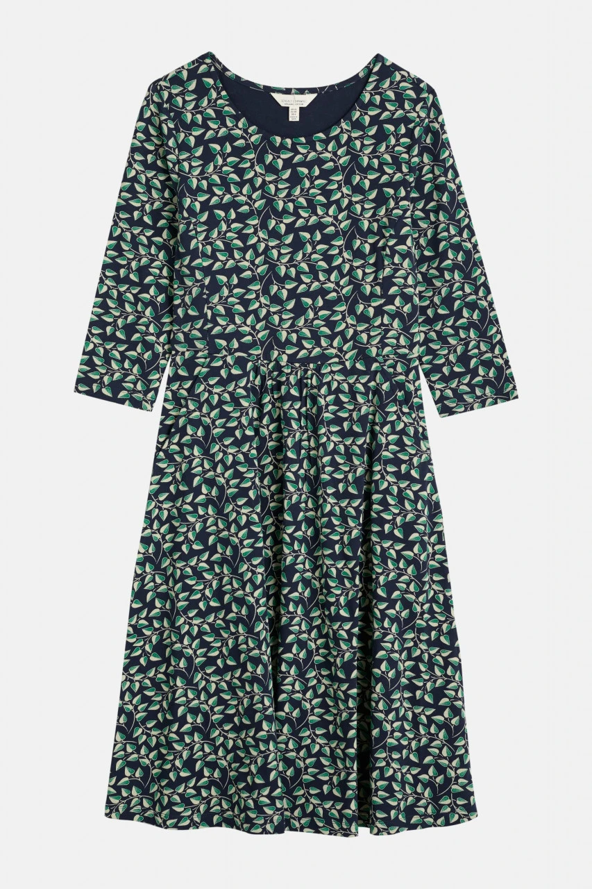 Leichtes, blaues 3-4-Arm-Kleid von Seasalt Cornwall mit grünem Blätterprint.Nachhaltigkeit: