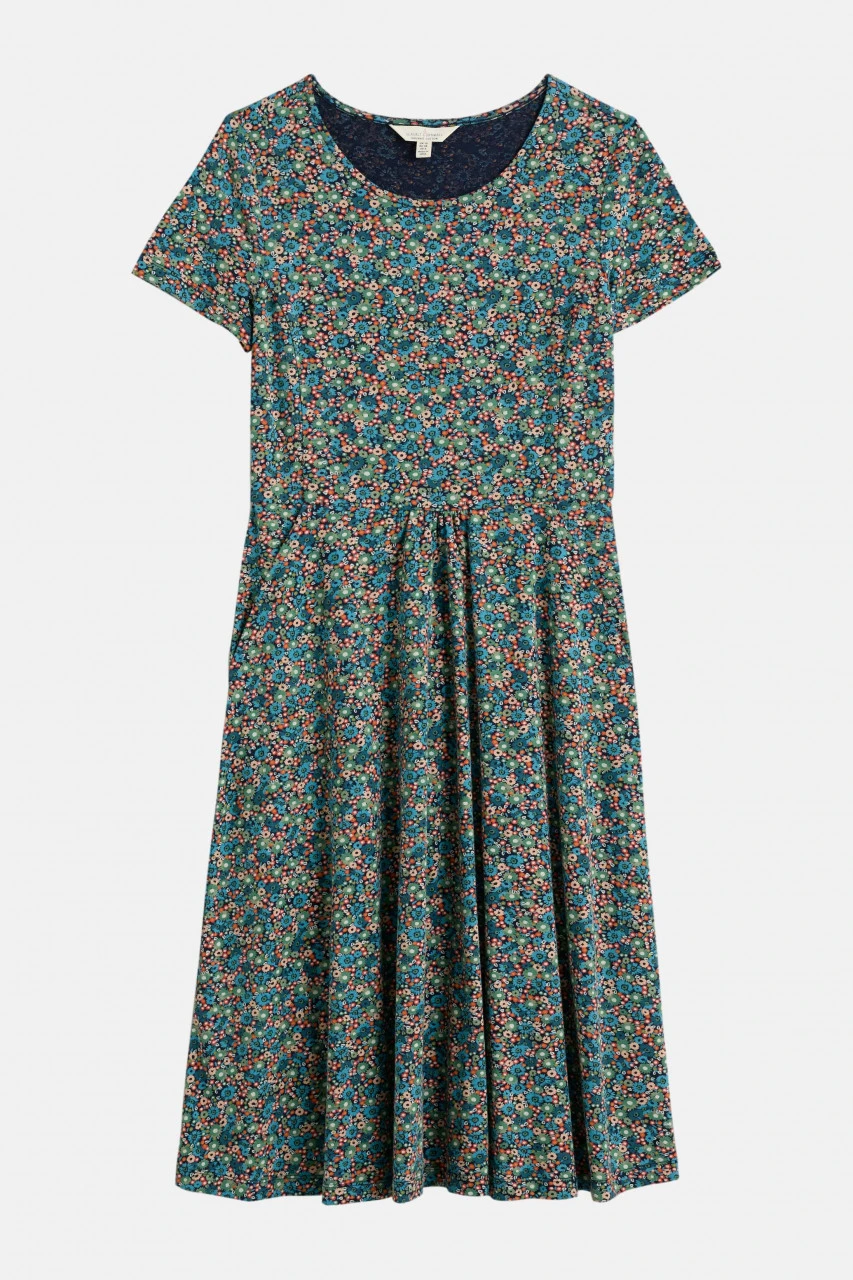 Sommerliches Kurzarmkleid von Seasalt mit Blumenwiesen Muster in einem Farbenspiel aus Blau, Türkis, Grün, Rot und Orange. Ein praktisches Highlight: das schöne Kleid hat zwei seitliche Taschen!Eigenschaften: