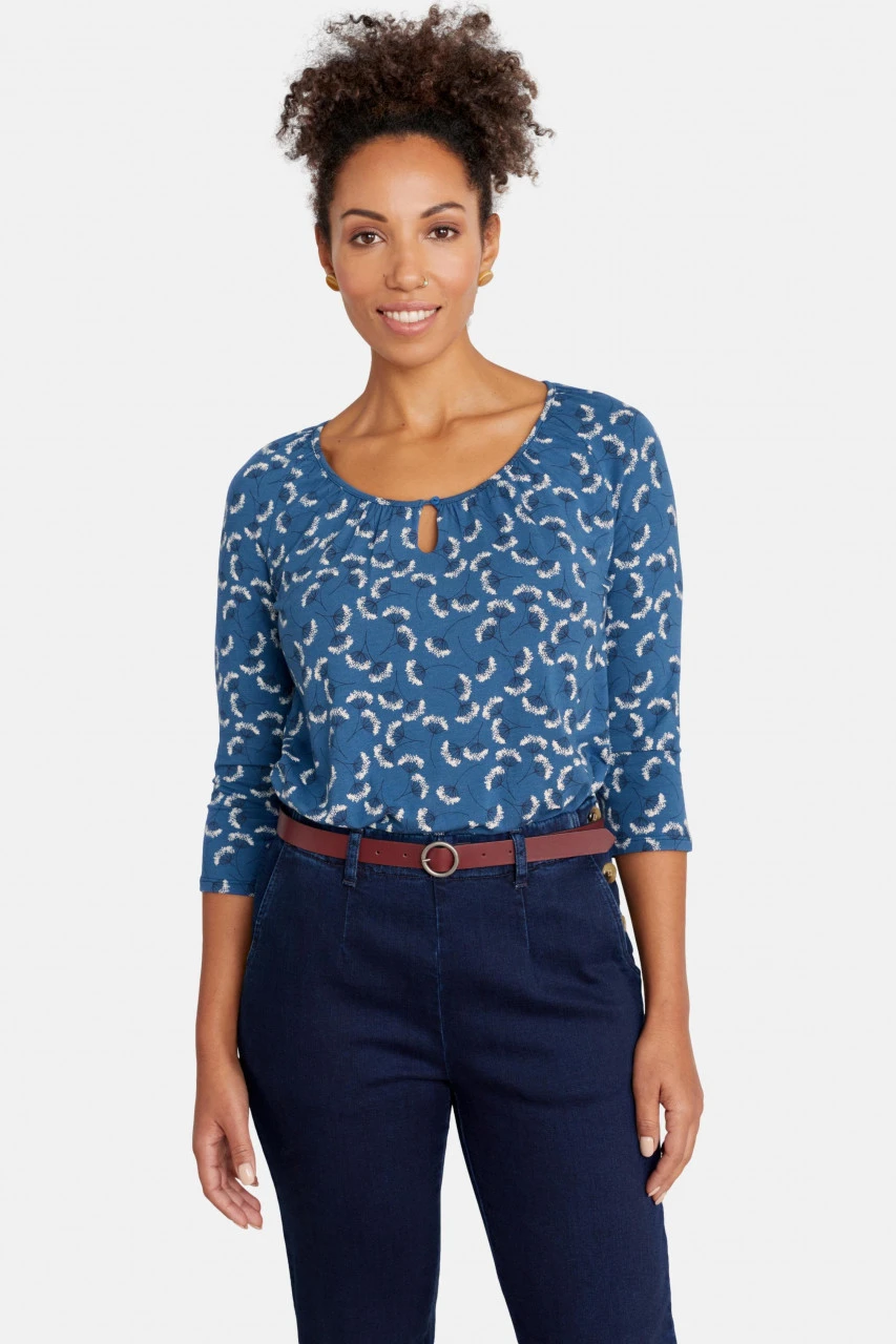 Schickes Dreiviertelarm-Blusenshirt von Seasalt Cornwall mit Blumenprint und Schlüssellochdetail am Ausschnitt.
