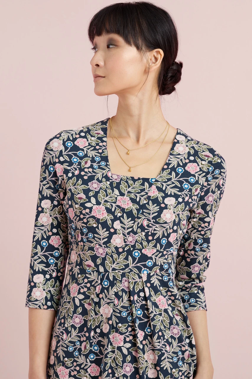 Mittellanges Kleid in Dunkelblau von Seasalt mit eckigem Karree-Ausschnitt und schönem antik wirkendem Blumen Muster. Der weiche Viskose-Baumwolljersey mit Folklore Print lässt sich besonders angenehm auf der Haut tragen.Eigenschaften: