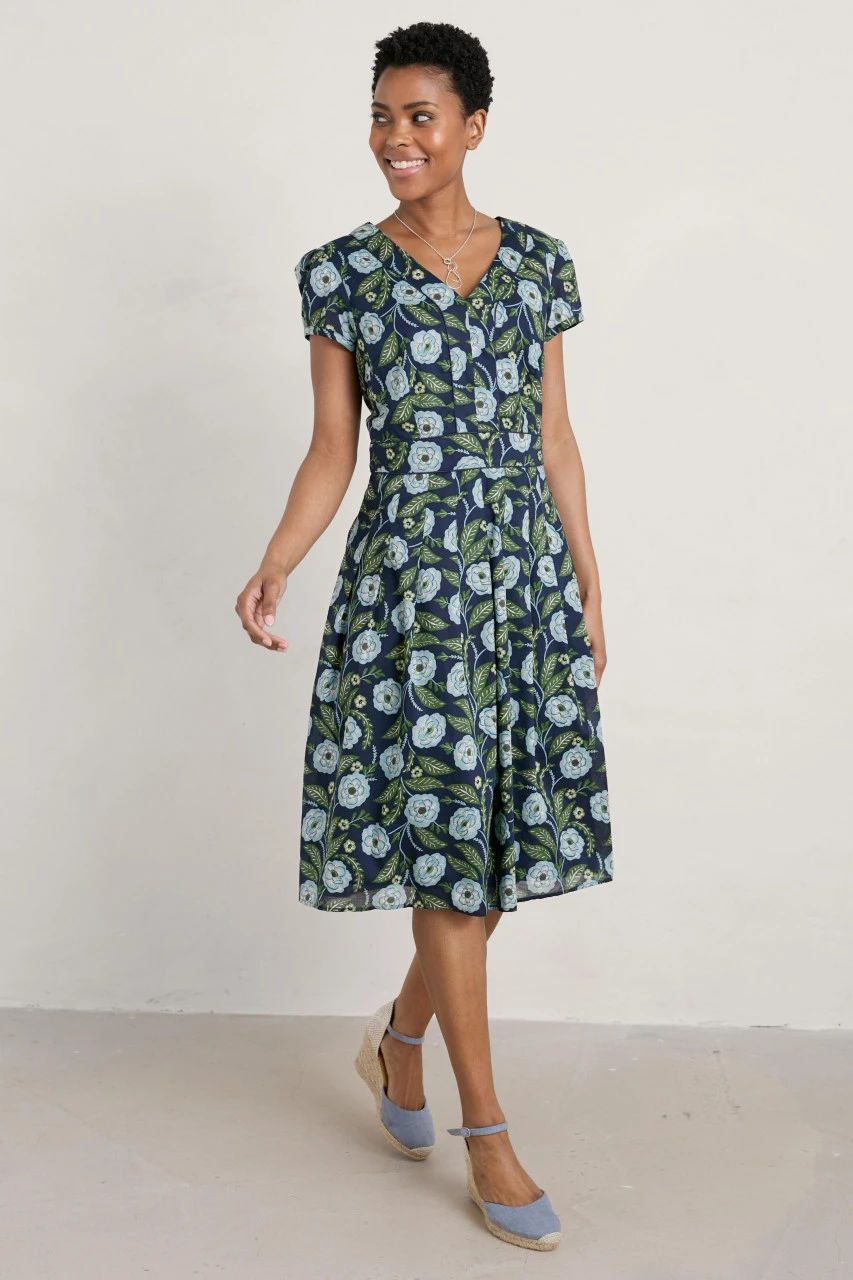 Luftiges Kurzarm-Sommerkleid von Seasalt Cornwall mit sommerlichem Blumenprint, seitlichen Eingrifftaschen und edlen Paspel-Details. Perfekt für feierliche Anlässe, als Hochzeitsgast oder für einen romantischen Ausflug ins Grüne!Eigenschaften: