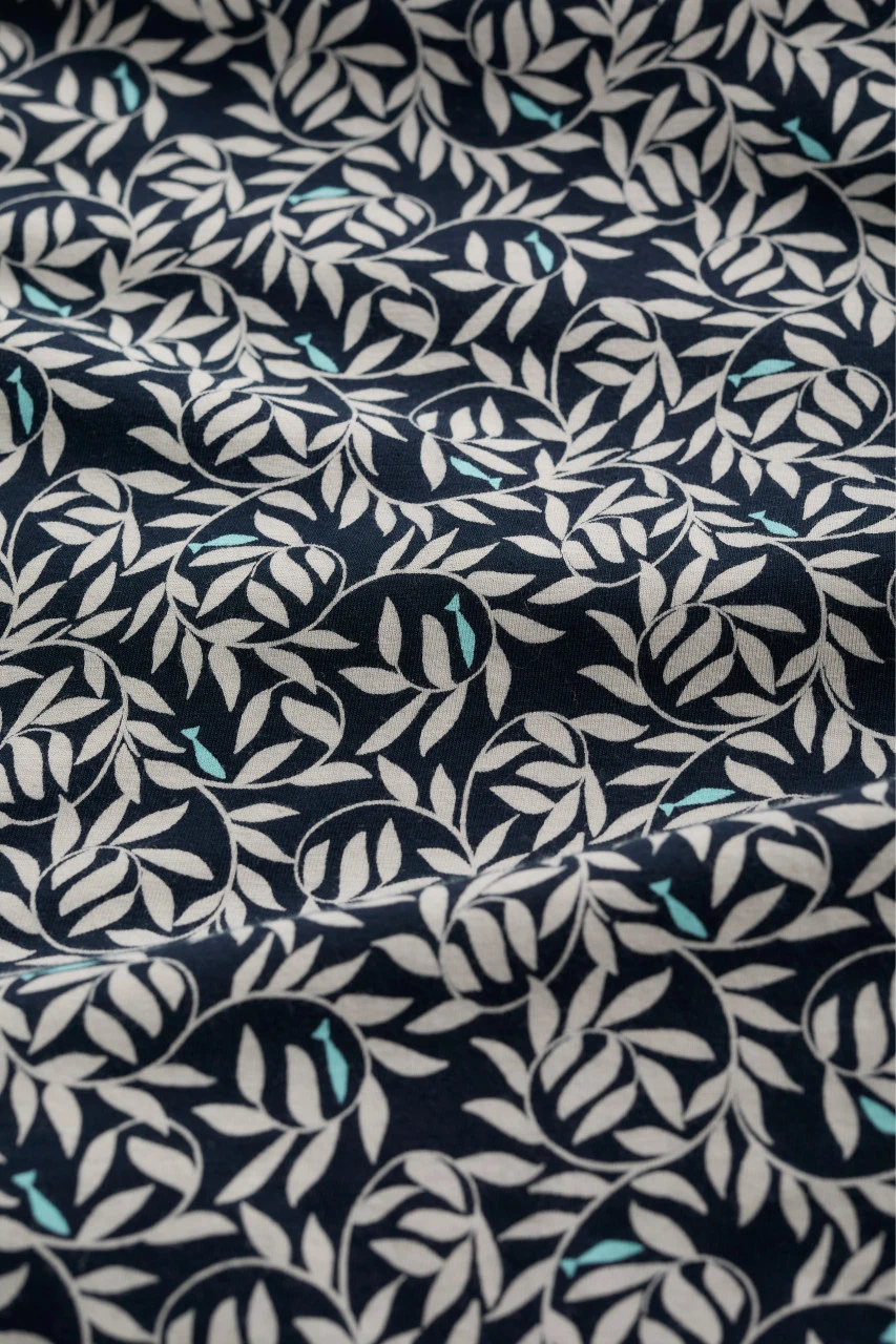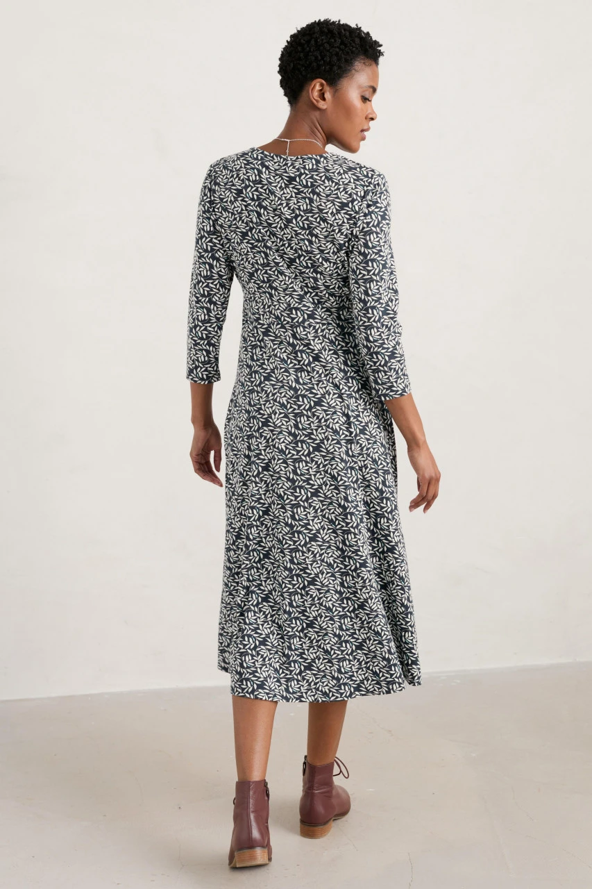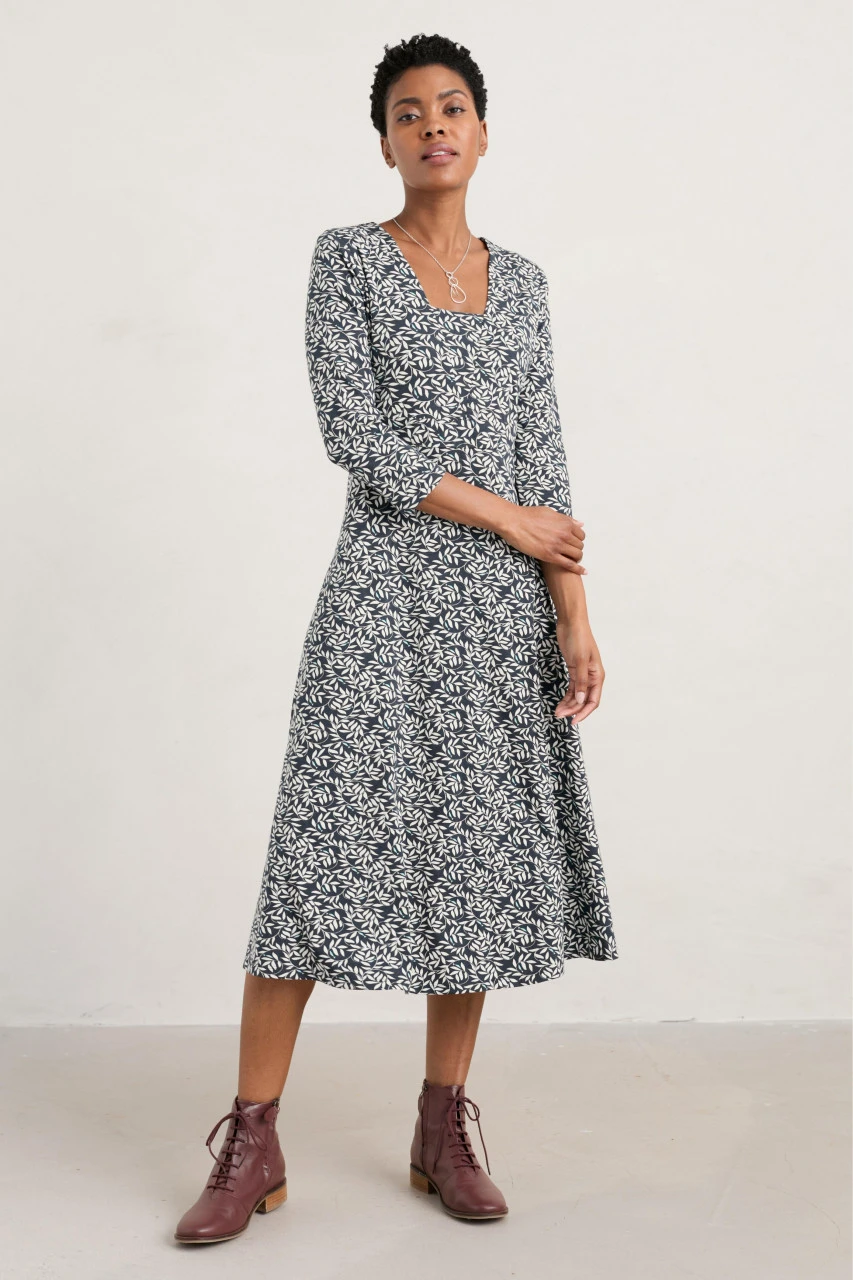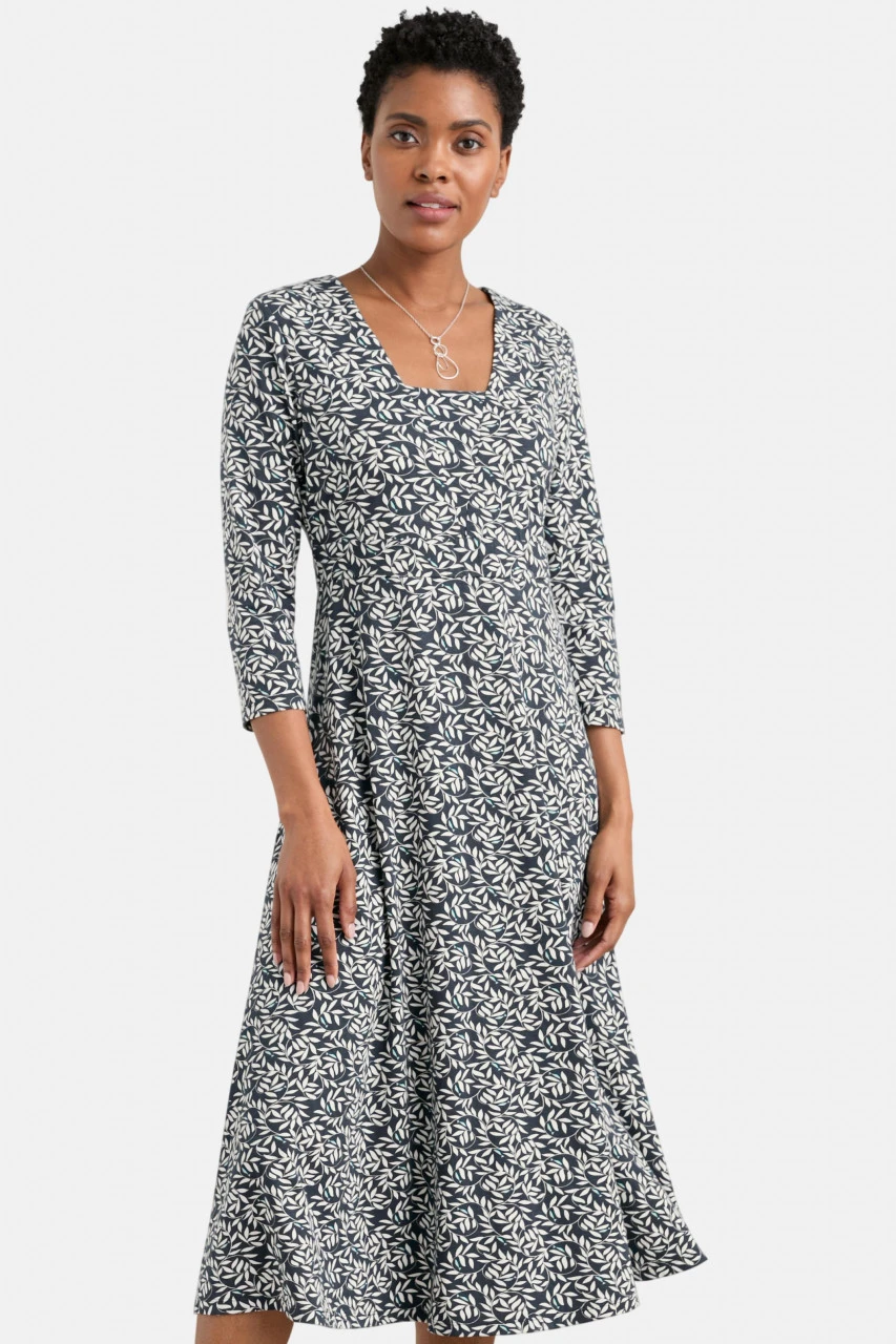Leicht fallendes 3-4-Arm Jersey Kleid von Seasalt Cornwall für Damen mit eckigem Karree-Ausschnitt und abstraktem Fisch- und Blättermuster in Dunkelblau und Weiß.Nachhaltigkeit: